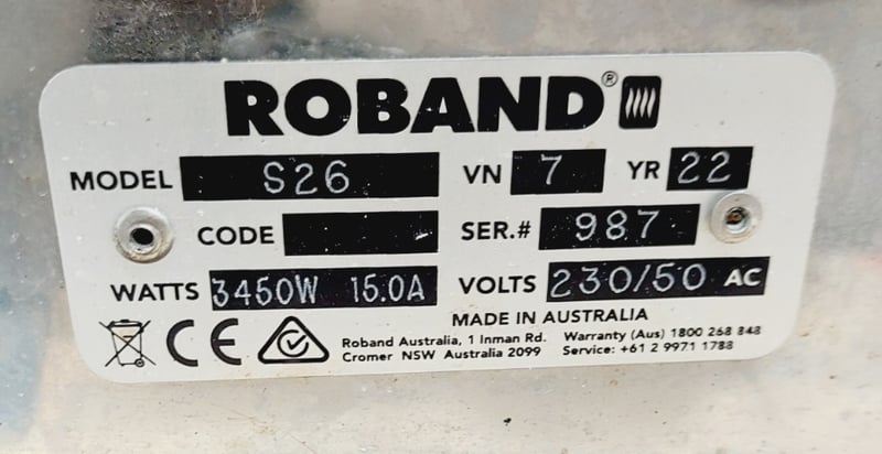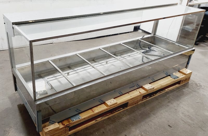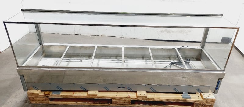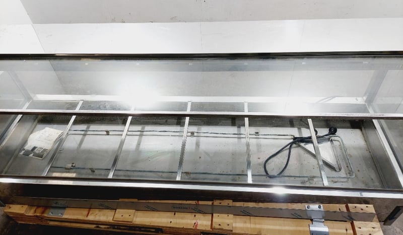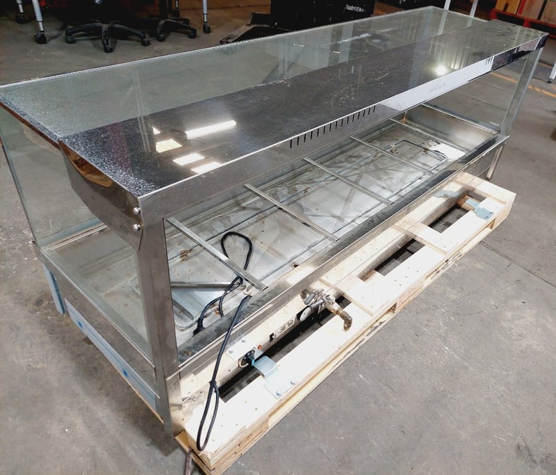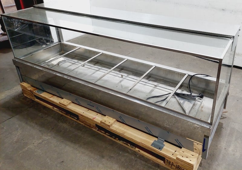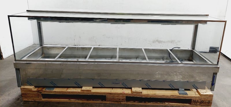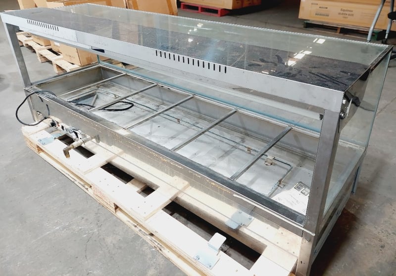 Roband S26 Hot Food Display Cabinet - Commercial Grade Bain Marie. Stainless steel construction with glass surround and top. Features 5 compartments with individual water bath heating elements. Angled front glass for optimal product visibility. Equipped with internal lighting and adjustable temperature controls.Model S26, Serial #987.