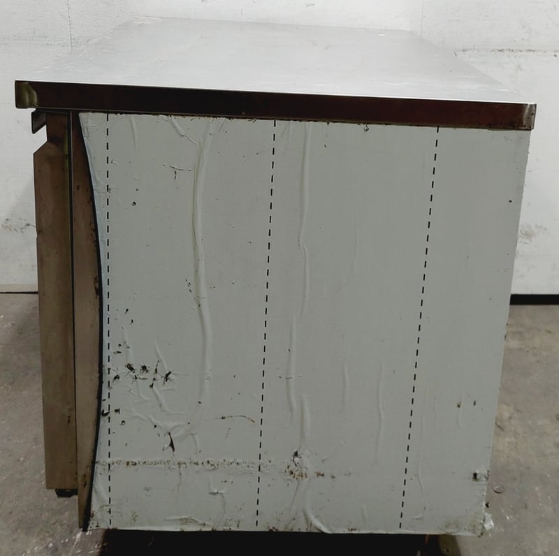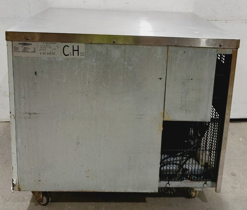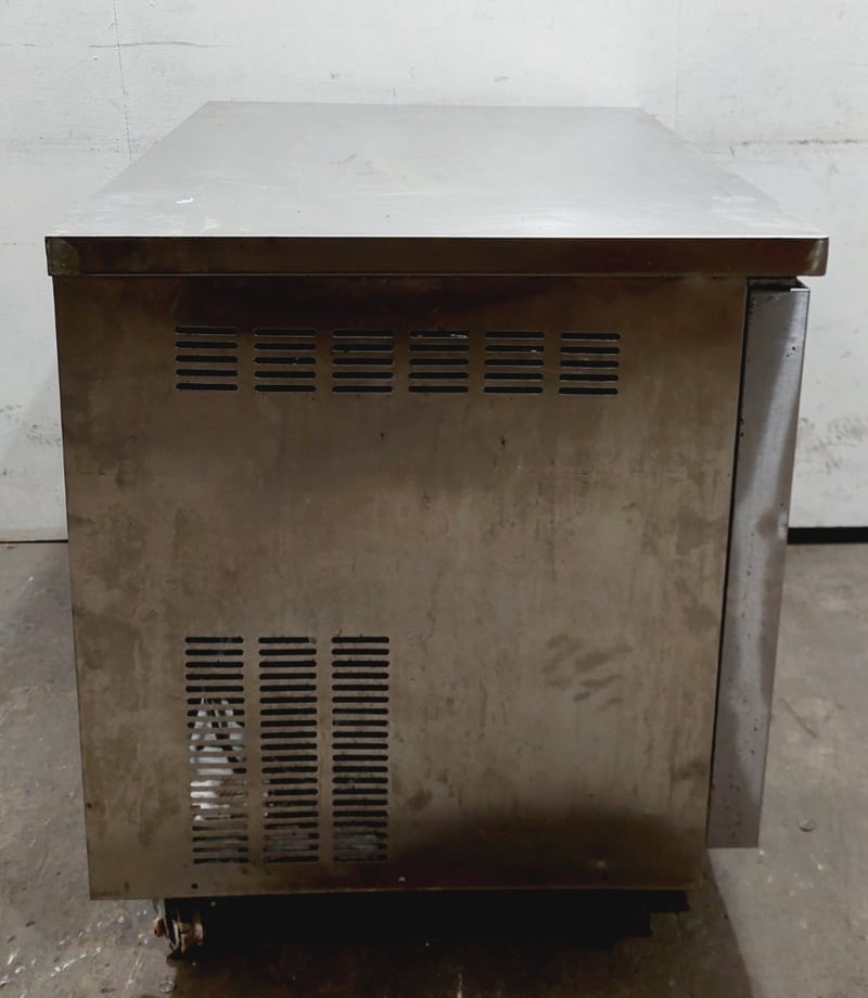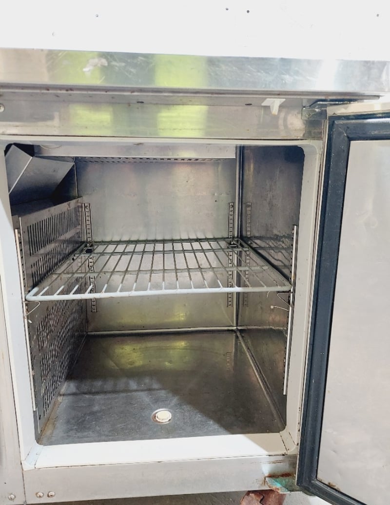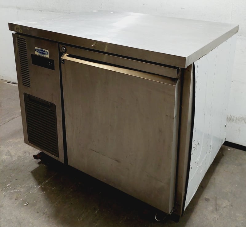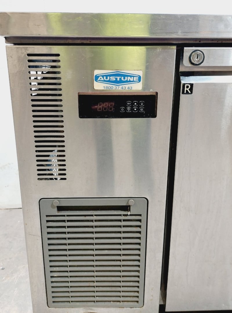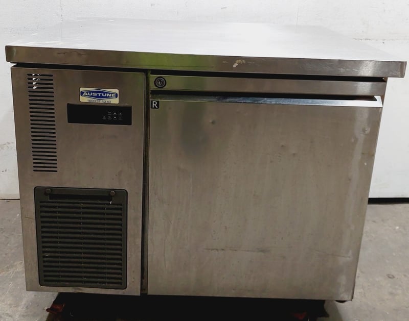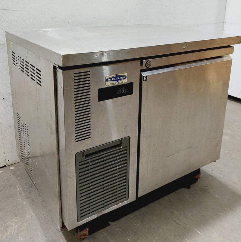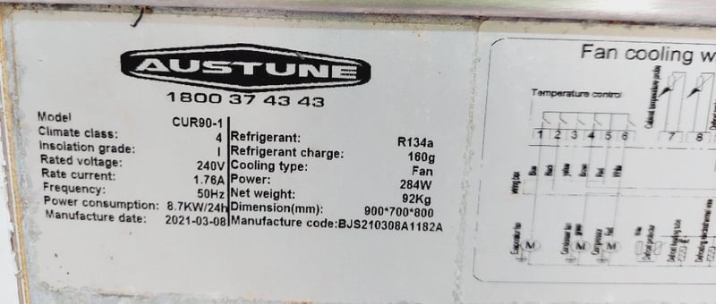 Austune commercial underbench refrigerator, Model CUR90-1, featuring a single solid door with stainless steel exterior and white laminate interior. Fan-cooled unit with R134a refrigerant system rated at 240V, 50Hz, 1.76A. Digital temperature control display.Dimensions approximately 900mm width x 700mm depth x 800mm height.Note: untested,signs of wear