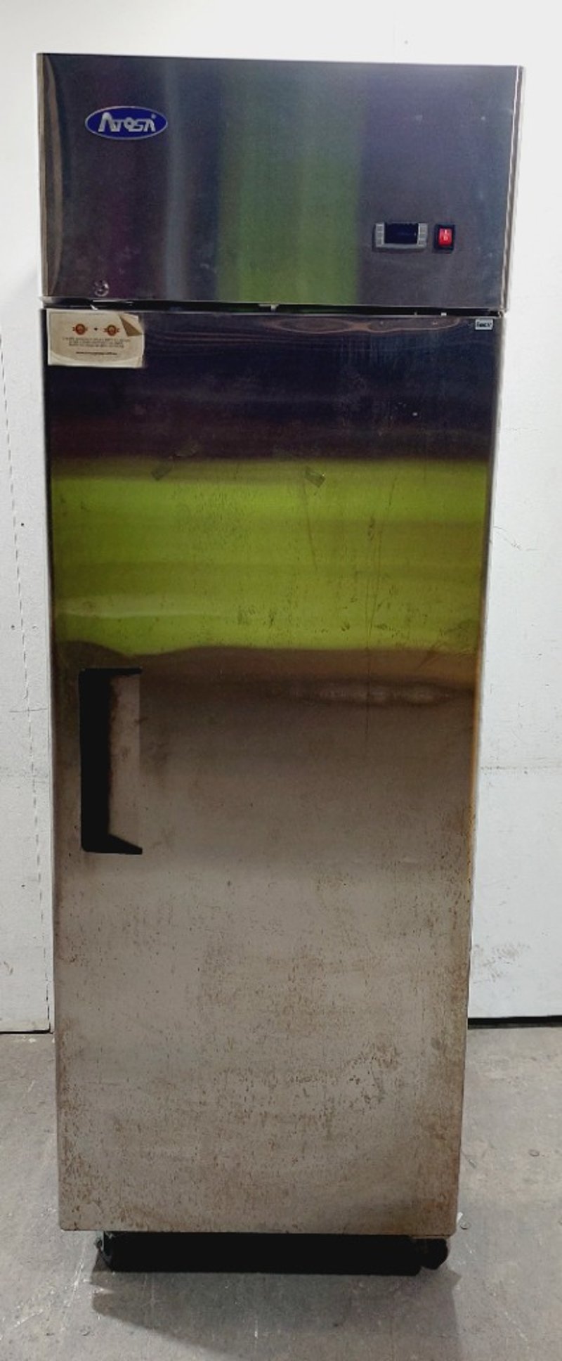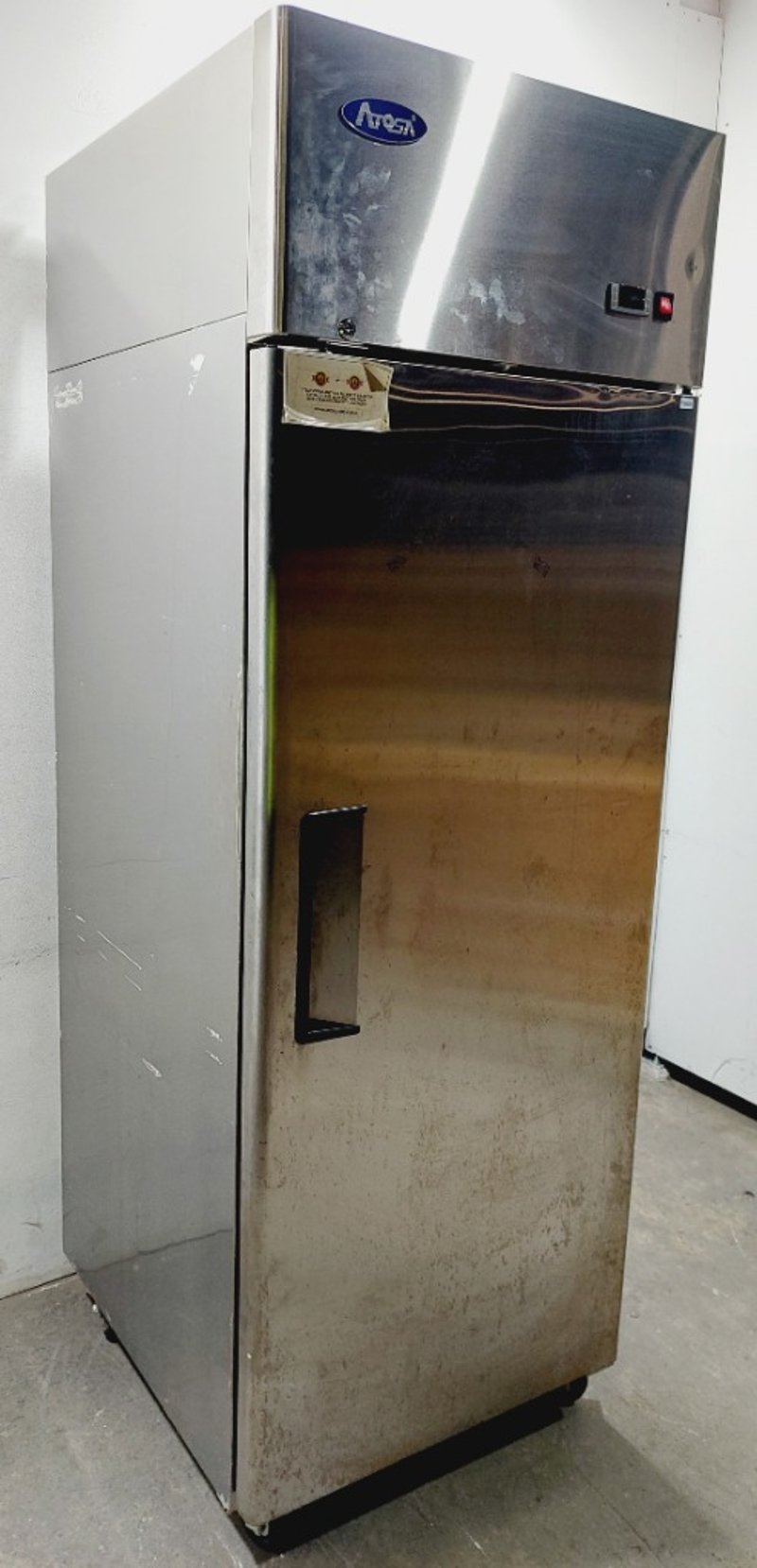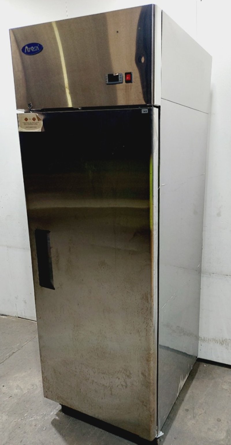 Atosa upright refrigerator model MBF8001 with 670L capacity. Features stainless steel exterior with black lower section and top-mounted compressor unit. Single door design with handle and interior wire shelving. Dimensions: 73 x 75 x 213cmNote: untested, signs of wear