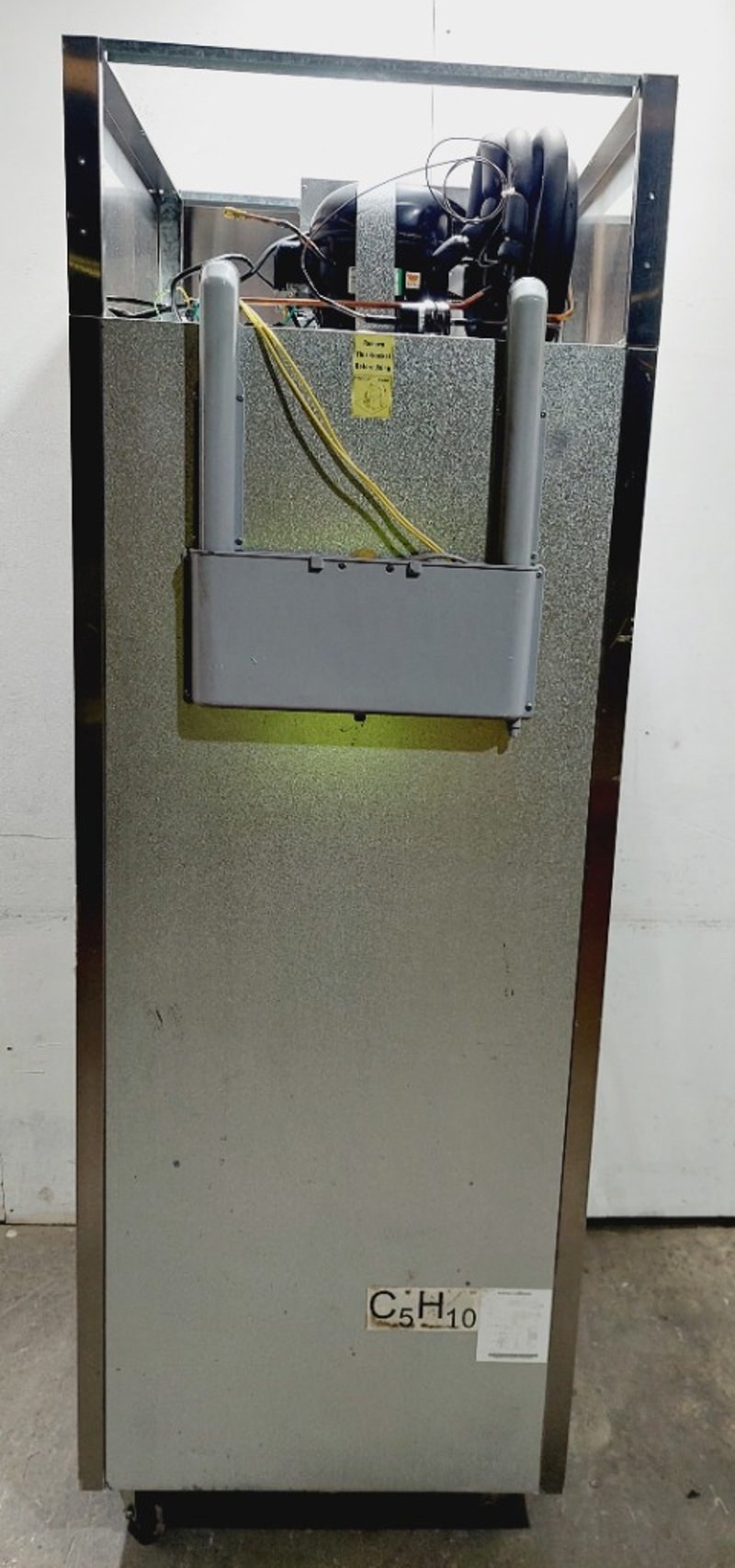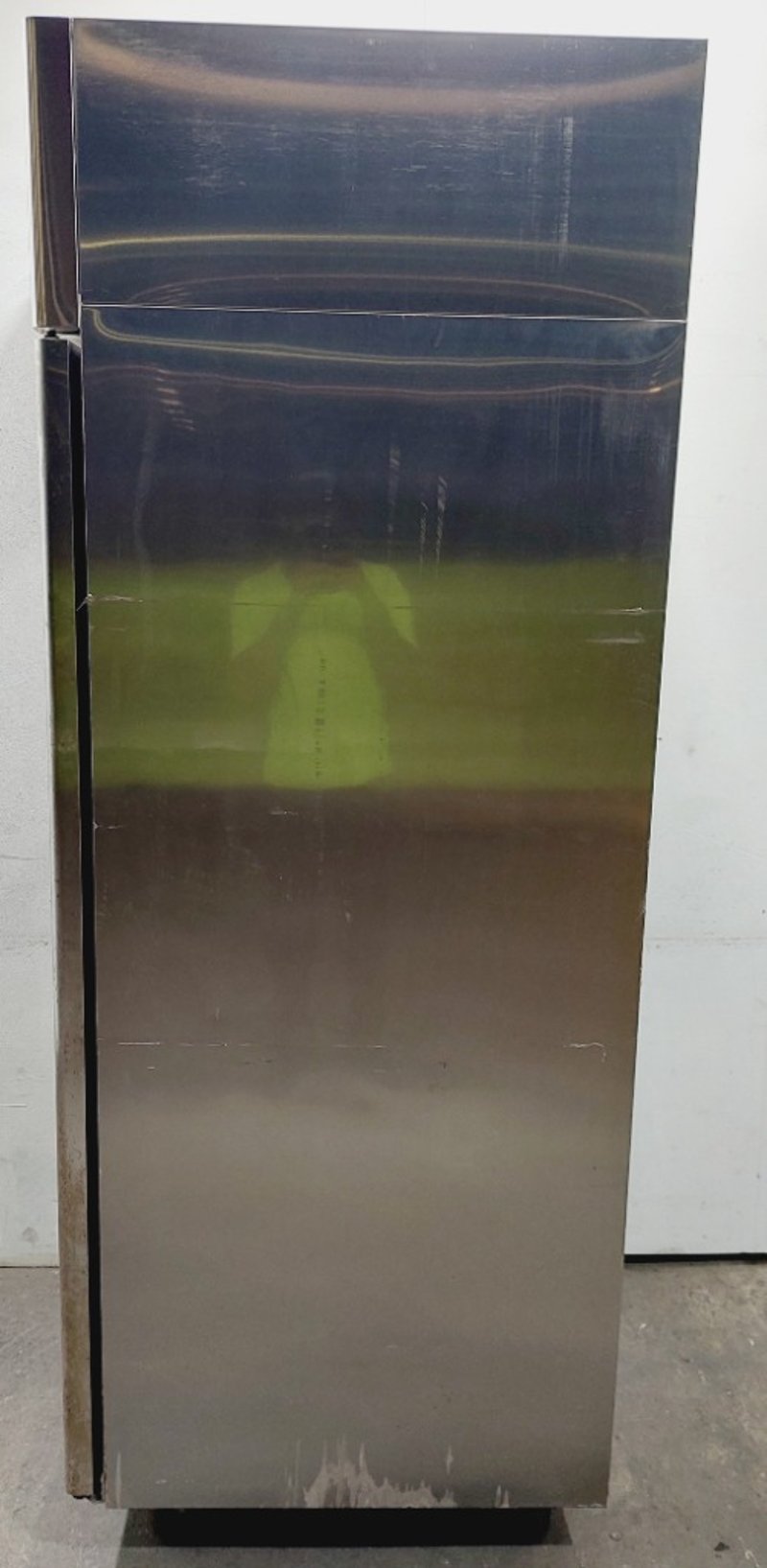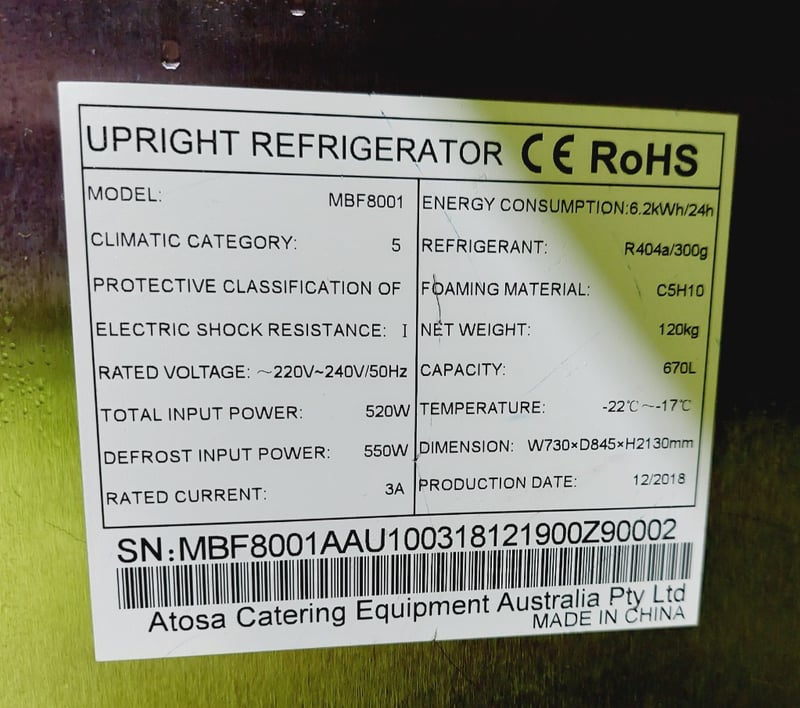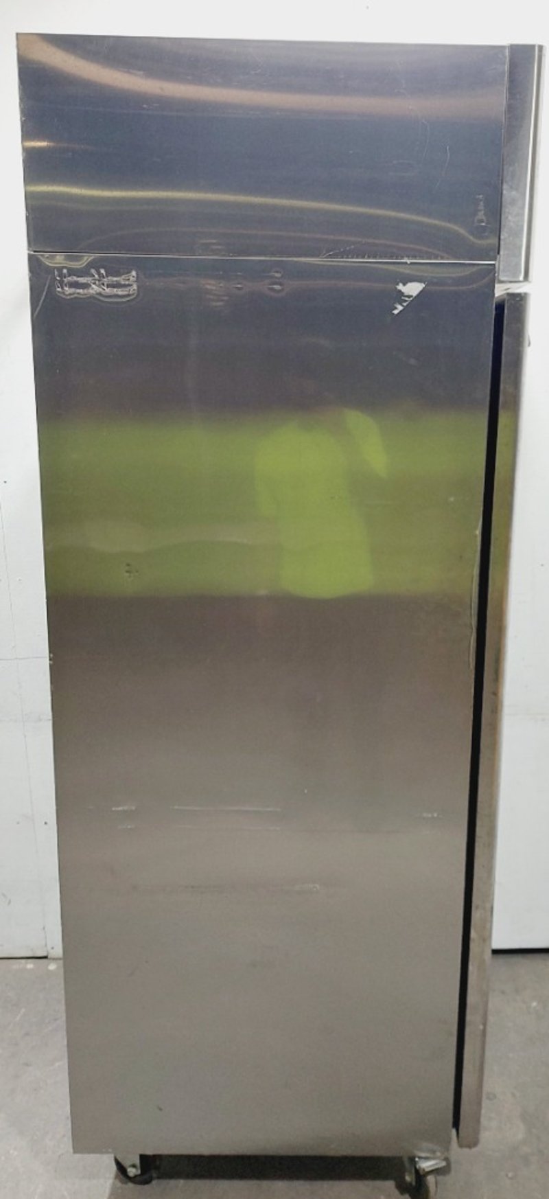 Atosa upright refrigerator model MBF8001 with 670L capacity. Features stainless steel exterior with black lower section and top-mounted compressor unit. Single door design with handle and interior wire shelving. Dimensions: 73 x 75 x 213cmNote: untested, signs of wear
