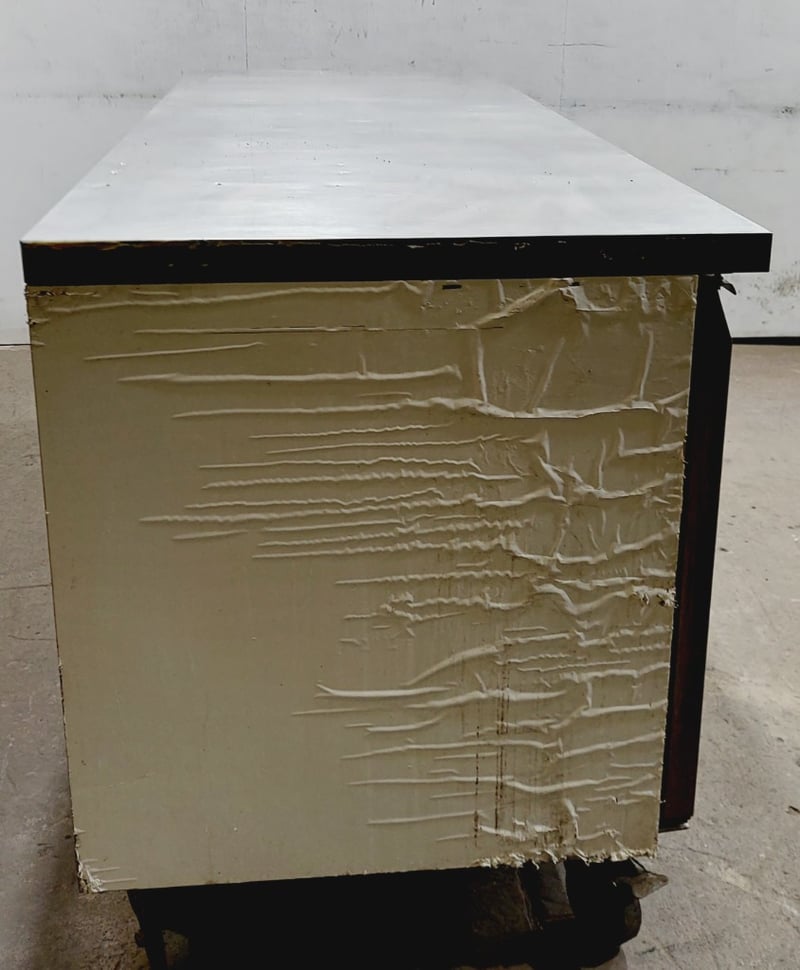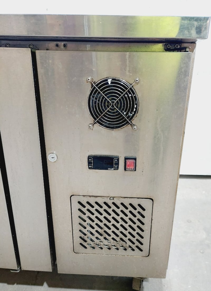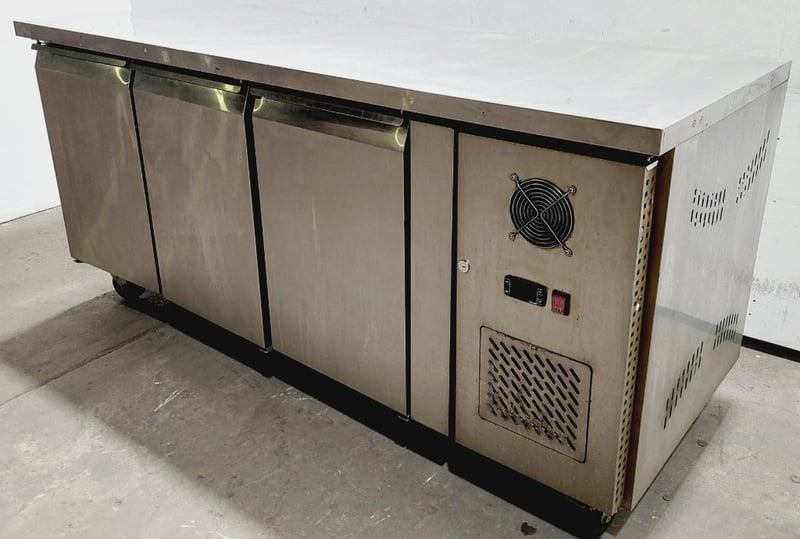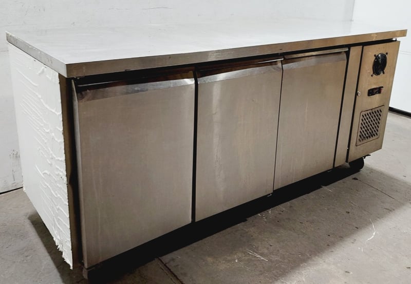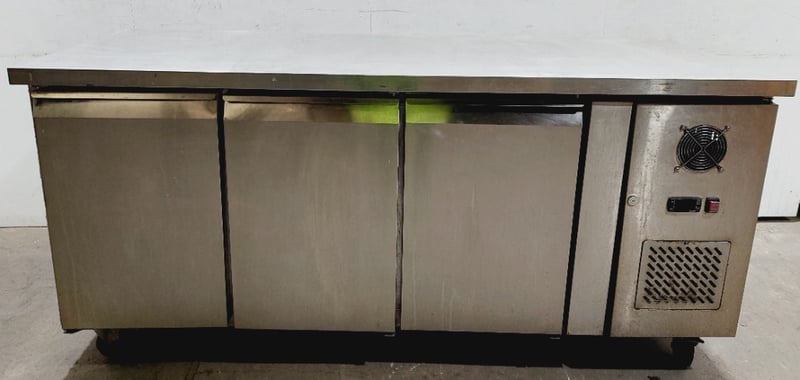 Commercial stainless steel refrigerated counter/prep table featuring three full-size doors with solid fronts ,Model GN3100TN Dimensions: 180 x 70 x 85 cmNote : untested,signs of wear