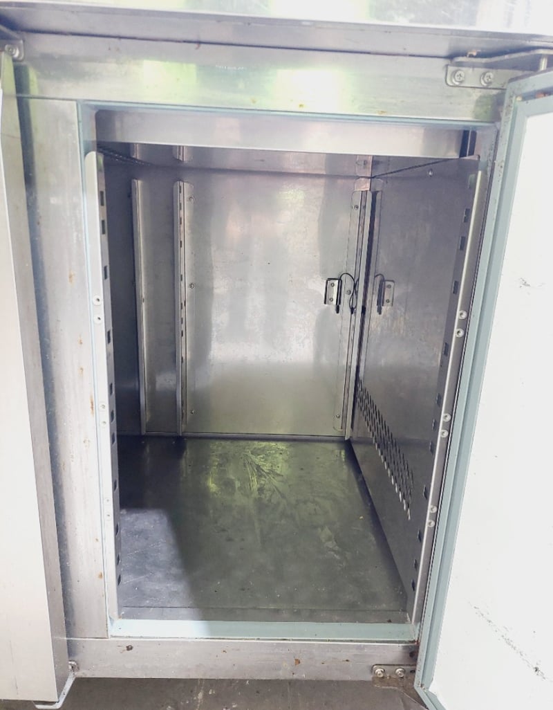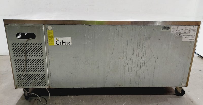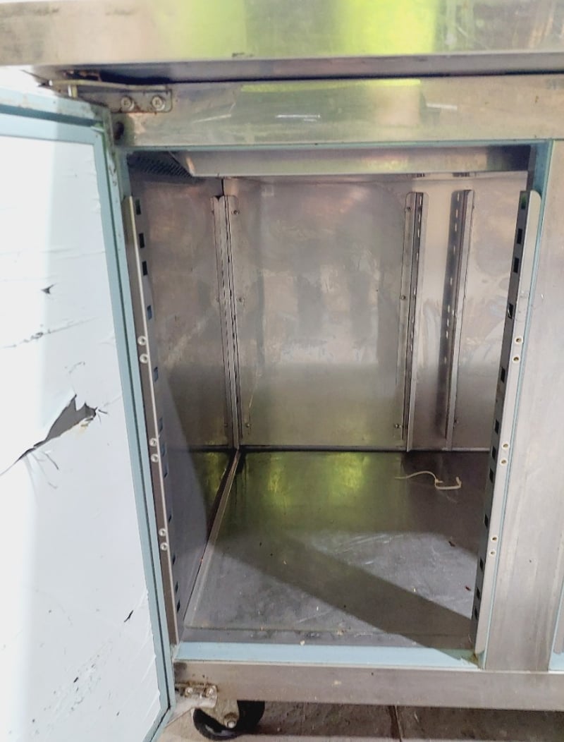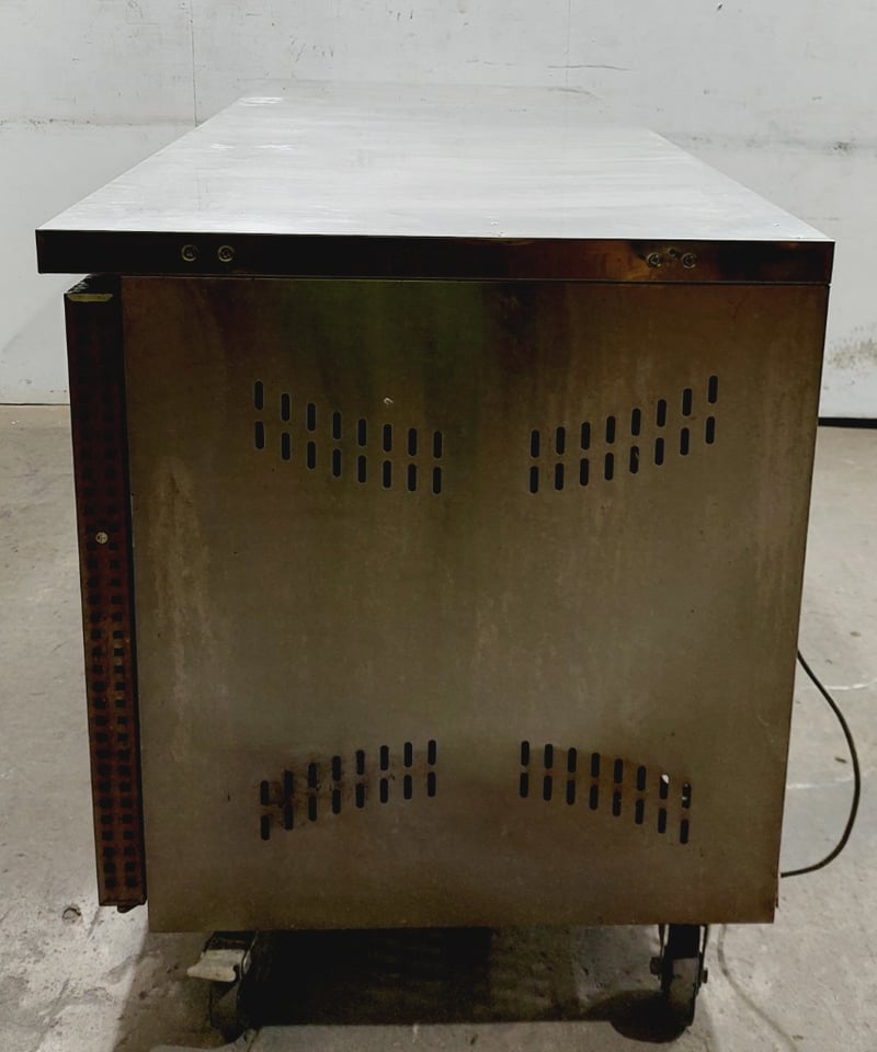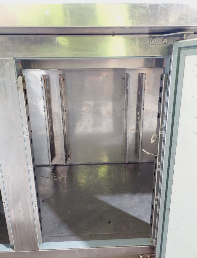 Commercial stainless steel refrigerated counter/prep table featuring three full-size doors with solid fronts ,Model GN3100TN Dimensions: 180 x 70 x 85 cmNote : untested,signs of wear