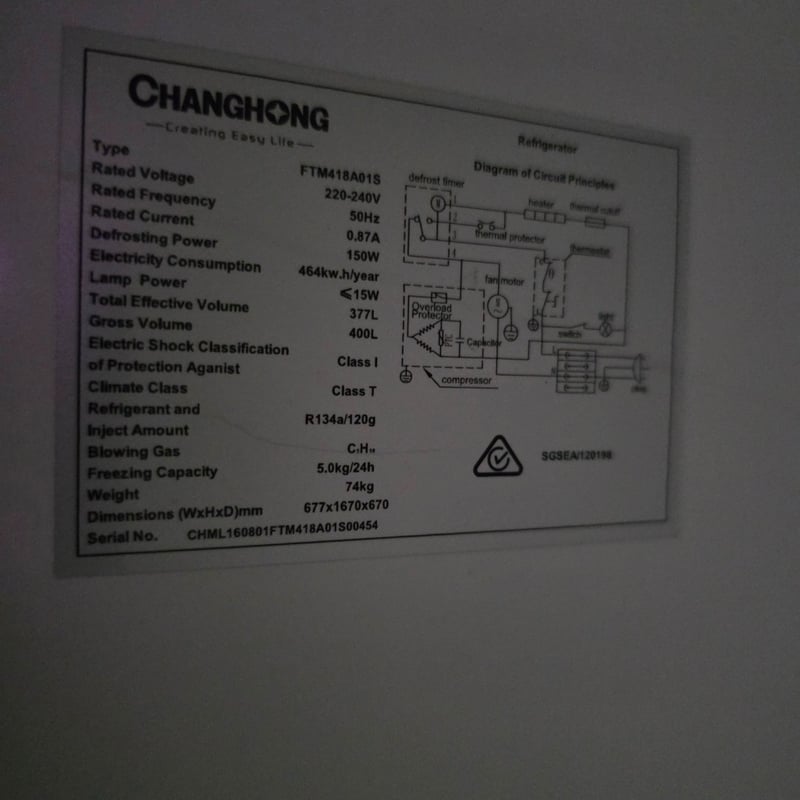 Refrigerator, changhong refrigerator, model FTM418A01S Dimensions approx 166cm H x 67cm W x 63cm D