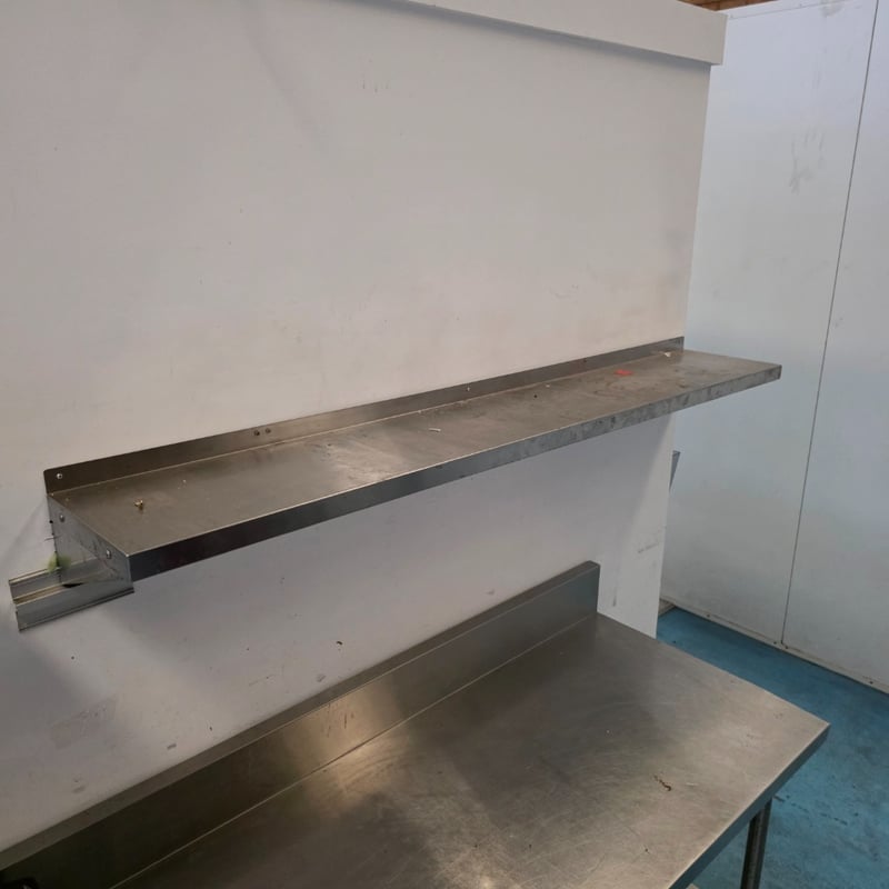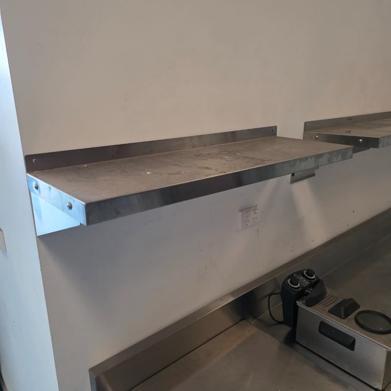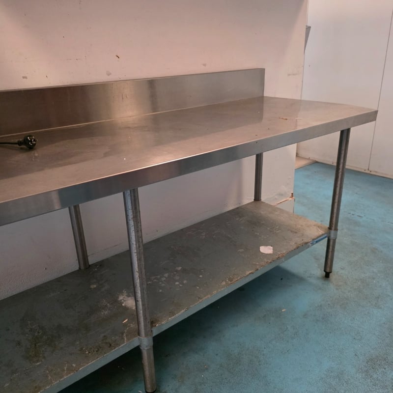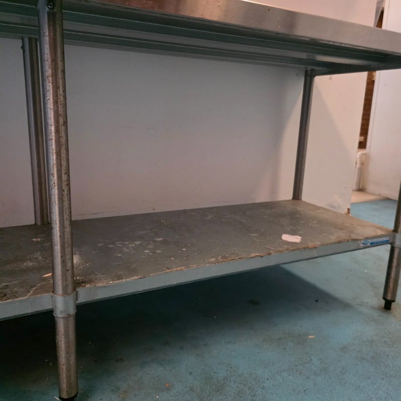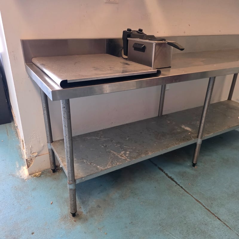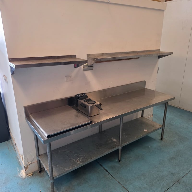 Comercial Stainless steel equipment, stainless steel bench with lower shelf including stainless steel shelving and a stainless steel fryer