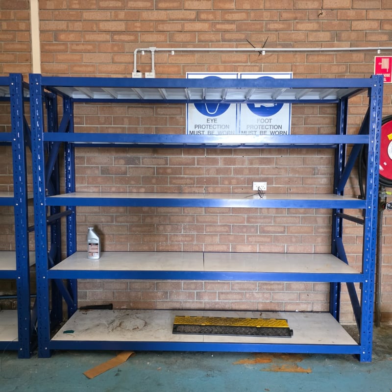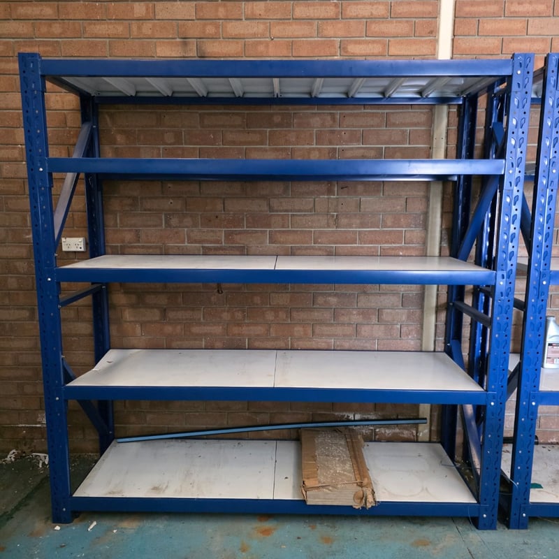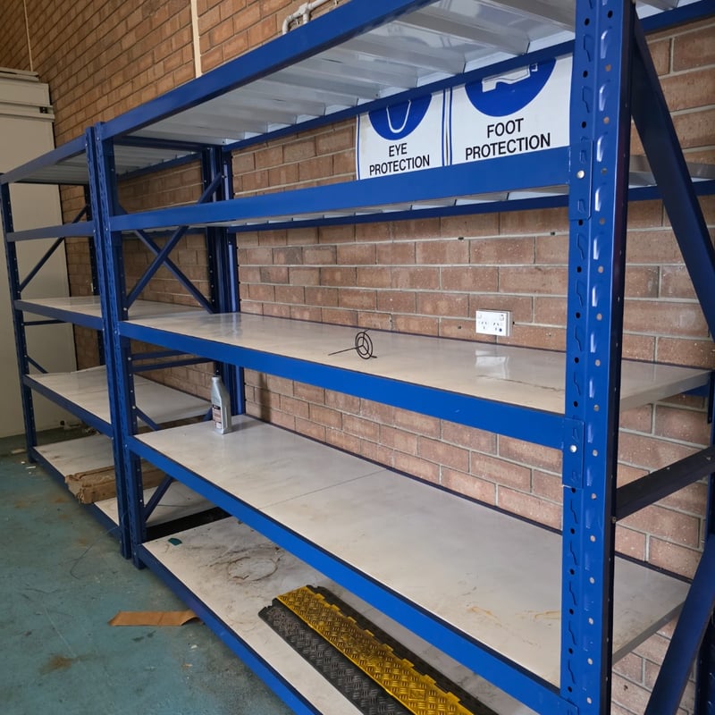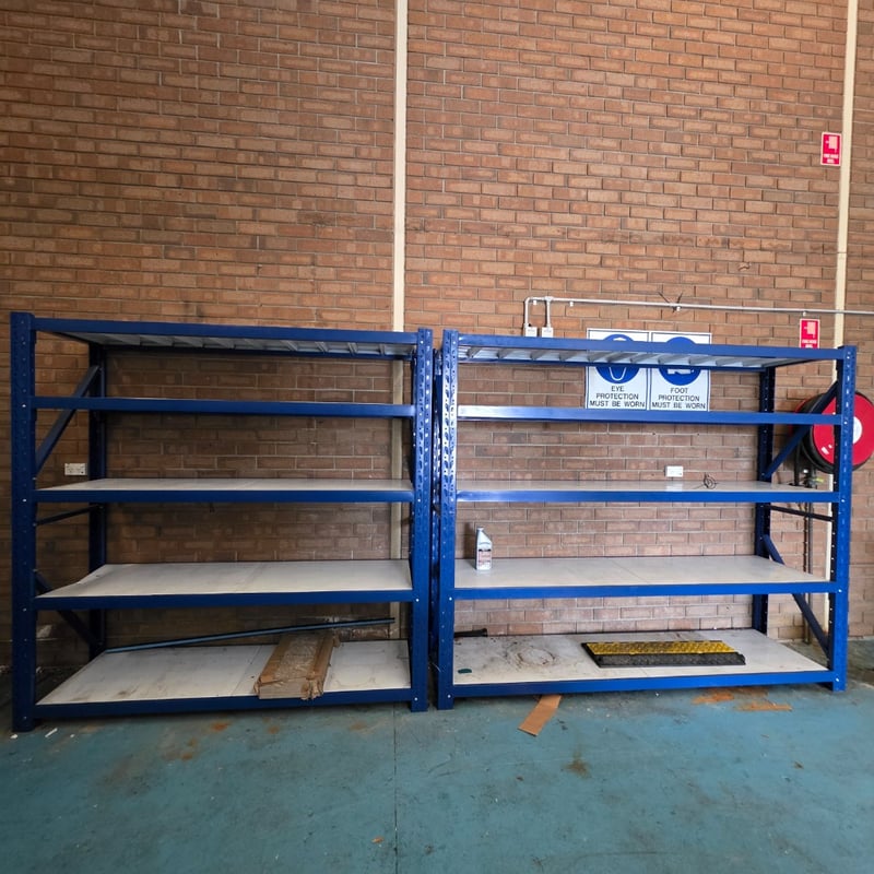Metal shelving with timber style boards Dimensions approx 200cm H x 200cm W x 61cm D Dimensions approx 200cm H x 240cm W x 61cm D requires proffesional dismantleing or decommission