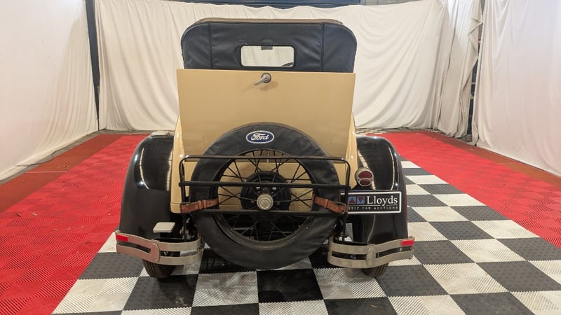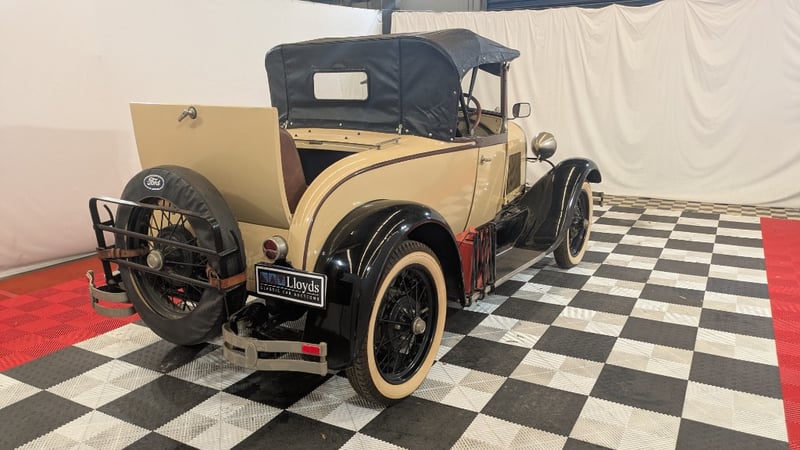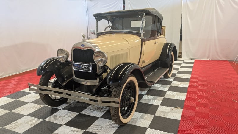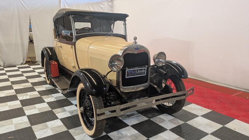 1928 Ford Model A Roadster with rumble seat. Rear wheel drive. 3.3 litre inline-4 petrol (200ci). 3-speed manual transmission. Indicating 81,915 miles. 4 seats (2 cabin plus 2 rumble seat). 2-door open body. Sold unregistered. No key.