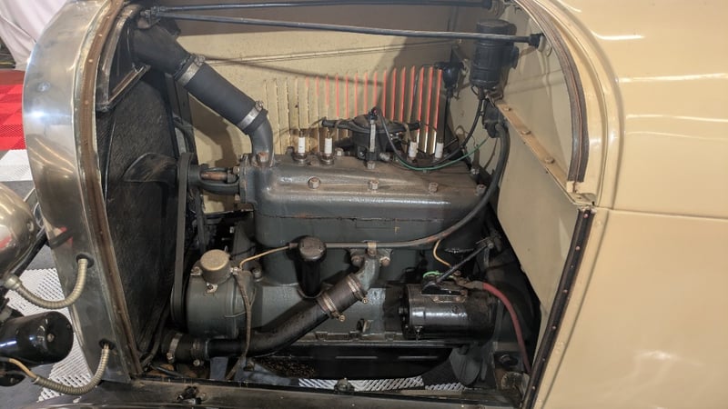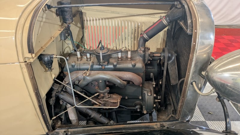 The paint is aged and showing its years, with some dulling, minor chips, and oxidation typical of a restoration now likely ten to twenty years old. This is absolutely a driver and a show-the-neighbours car, not a concours contender. The engine (original 3.3 litre 'A' engine, confirmed by the engine number format) is the unit that went in the car, though without the hood open for inspection a full assessment is not possible. The fact it comes with no key is worth noting but is very common for Model A's, as keys are generic and a locksmith or Model A club member will sort it out easily.