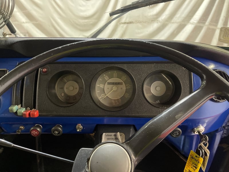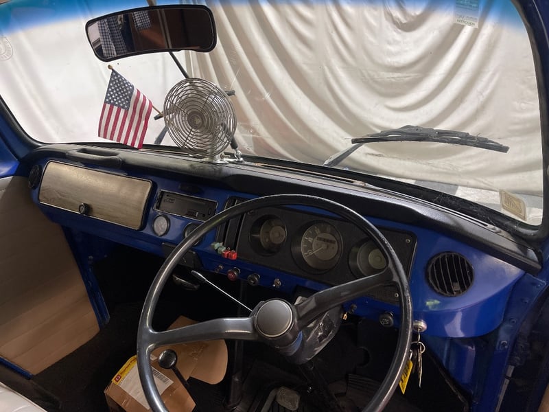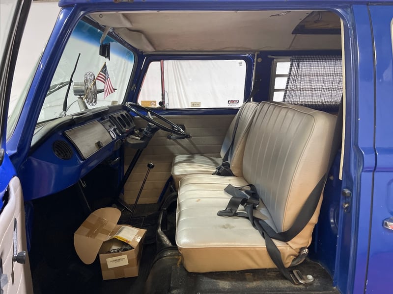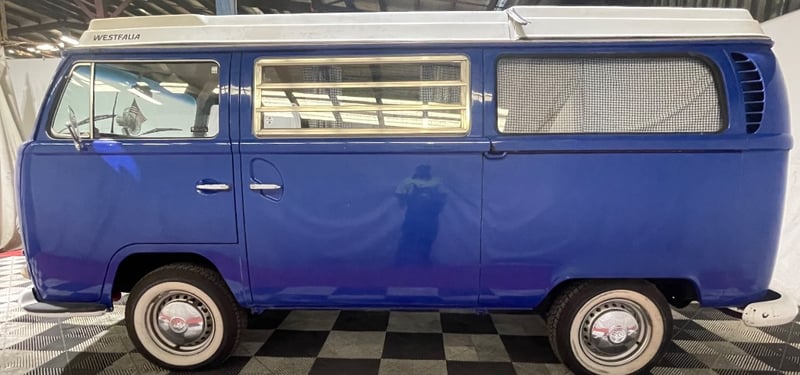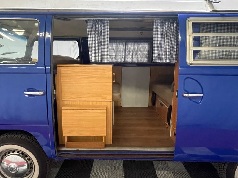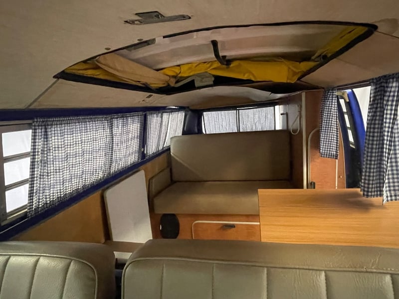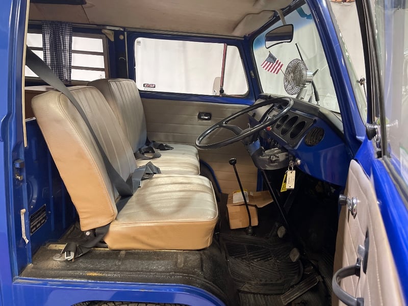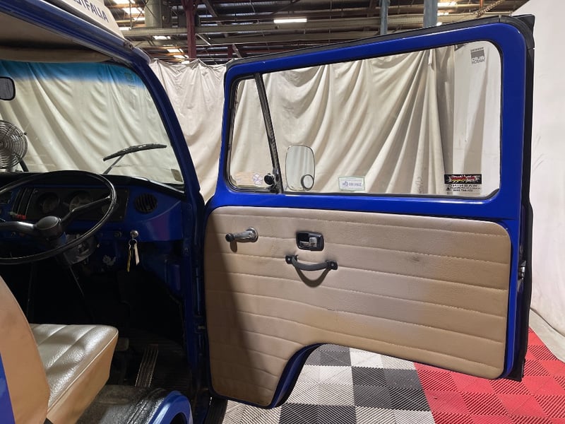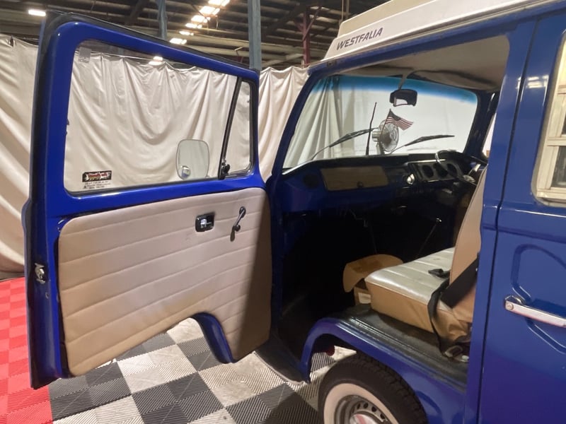 The body has been resprayed in a vivid cobalt blue, not an original VW colour but it suits the van beautifully and the panels underneath are straight and solid. The pre-1972 front end is correct for the year, identifiable by the indicators sitting below the headlights rather than above them. The Westfalia pop-top shell presents well in white, the WESTFALIA script is intact, and the Westfalia-specific jalousie (louvered) windows on the passenger side are all there. These are the details that matter to collectors. The interior cab area is tidy with quality door cards and period-appropriate cab trim. Unfortunately the listing photos do not show the camper interior in detail, so buyers should request a video inspection to assess the condition of the cabinetry, bed platform, sink, and cooking facilities. That is the most important unknown here.