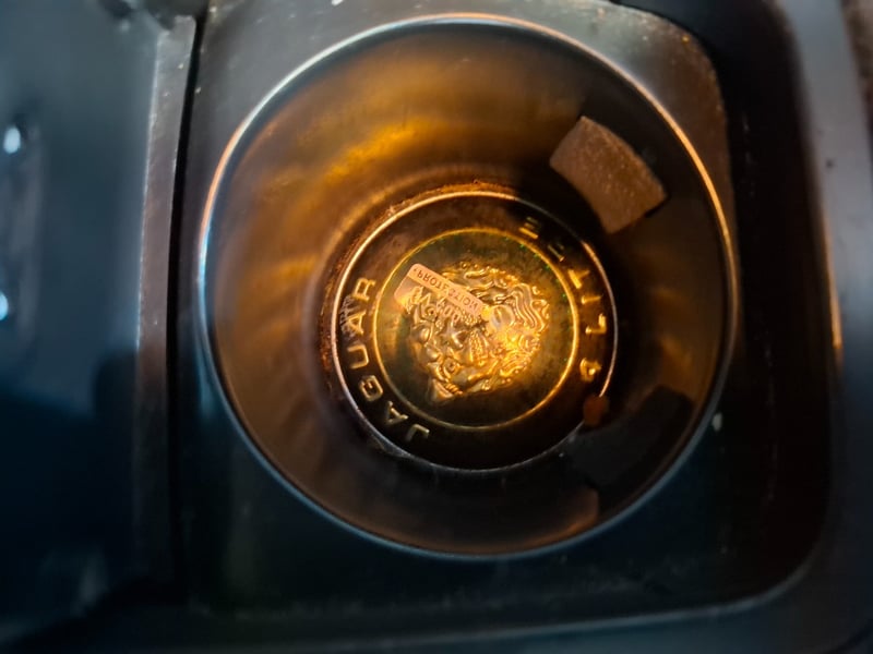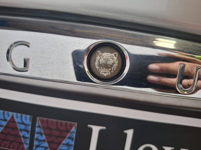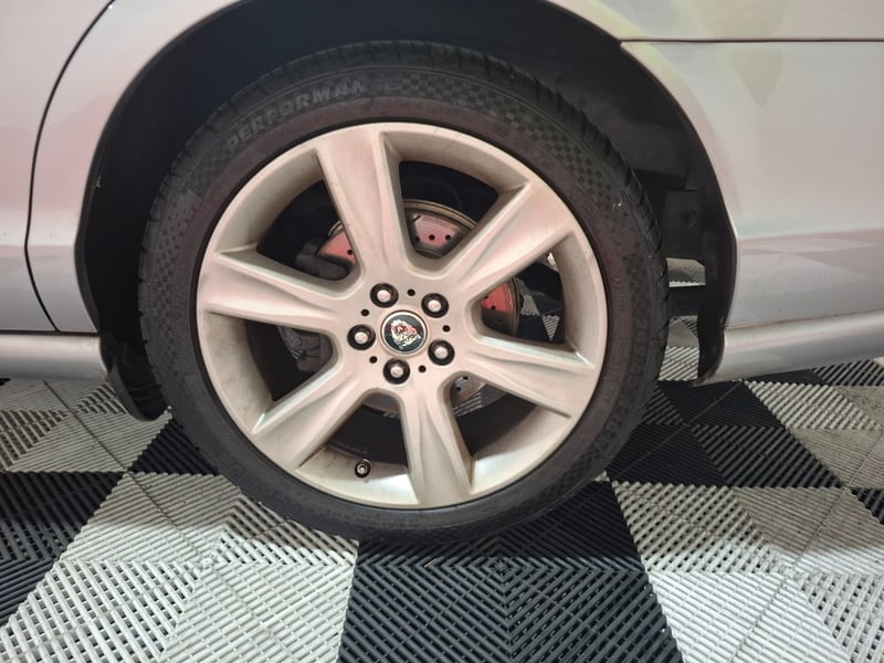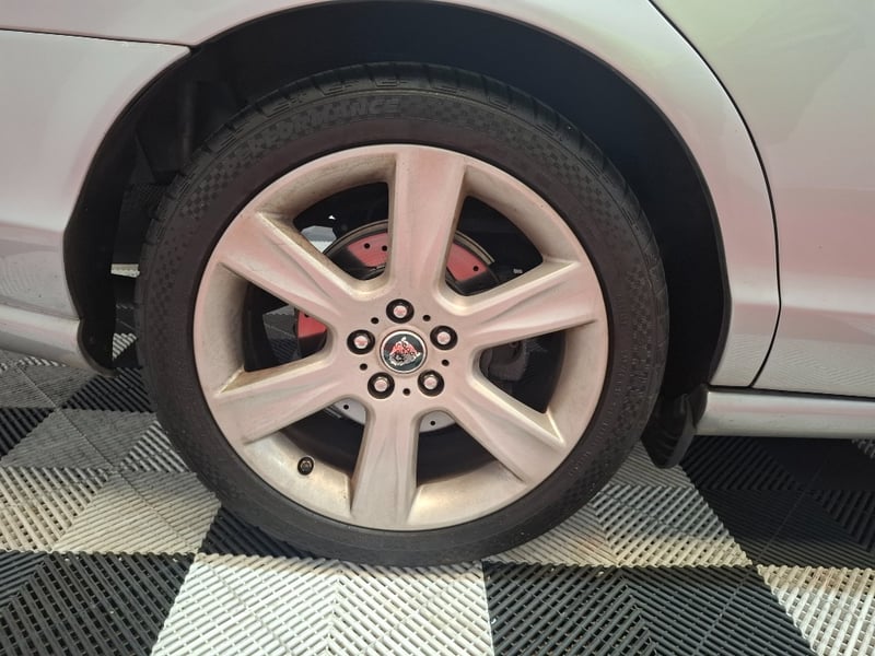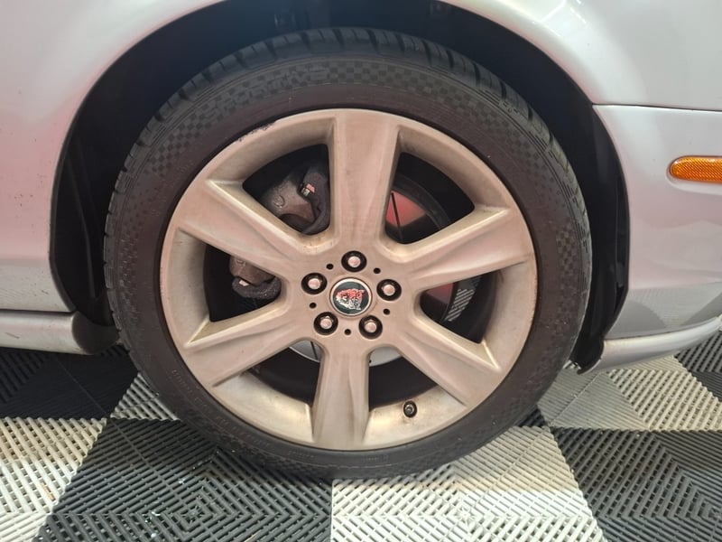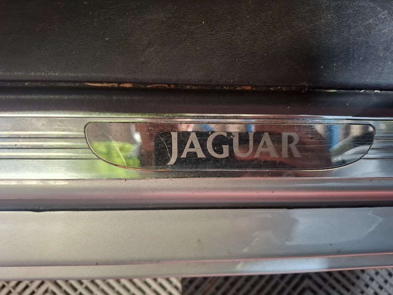 Finished in silver over a black leather interior, the combination works perfectly with the Jaguar styling. The body is straight with all panel gaps consistent and factory-correct, the iconic chrome mesh grille is undamaged, and all Jaguar badging is present and correct. No obvious rust, no collision evidence. The headlights show moderate hazing typical of the era, which is a straightforward polish or replacement job. The one notable cosmetic issue is the alloy wheels, which show clear coat deterioration resulting in a tarnished, oxidised finish. This is purely cosmetic but it does stand out. A refurb on those wheels transforms the whole car.