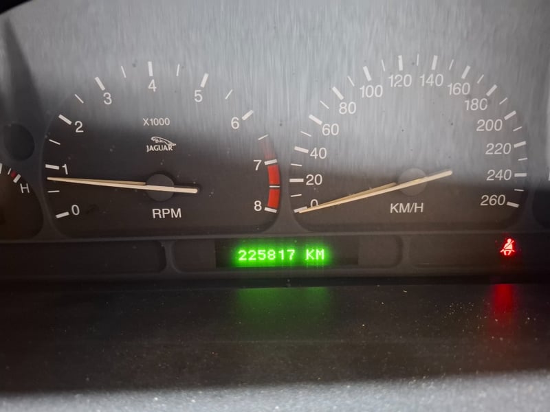 Inside, the black leather interior is complete and functional with all the SE appointments present. Dashboard is crack-free, a significant positive for a Queensland car. The burr walnut veneer shows some age and mild lacquer wear but is not delaminating. The original Jaguar head unit is present with a CD stacker in the boot, the factory Sat Nav is there, and the car comes with log books and owner's manual, which is increasingly rare at auction. The boot is clean with no signs of water ingress. Engine number 0105030726 is recorded. Mileage is honest at 225,817km but that is not a concern for the AJ-V8 when properly maintained. These engines are robust and well-supported. This is a stylish, well-equipped classic Jag with provenance documentation, offered at a price guide that makes it a realistic purchase.