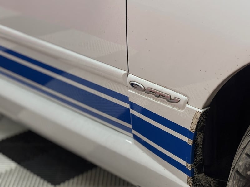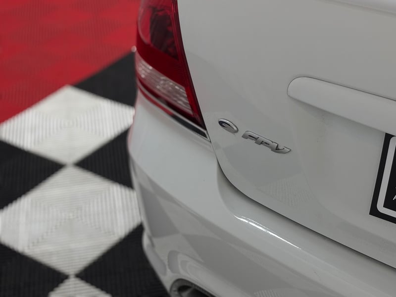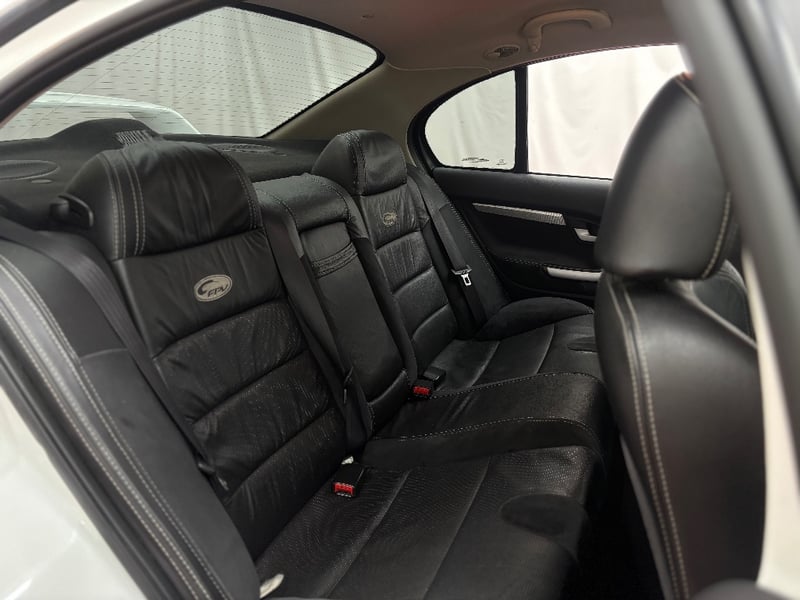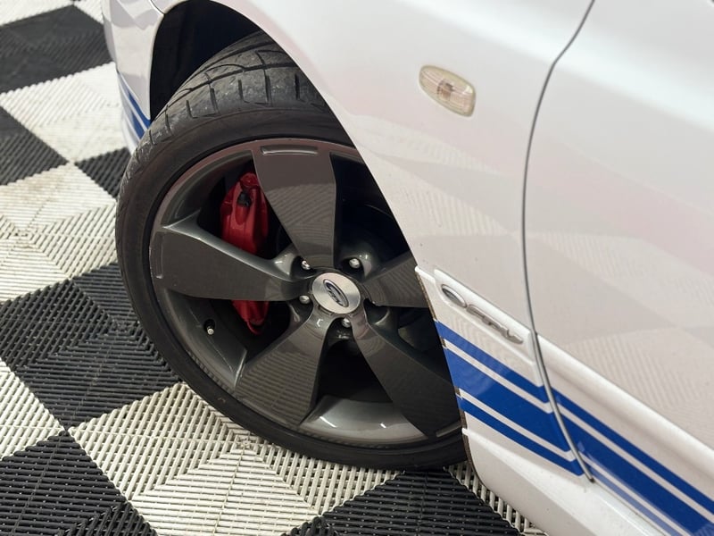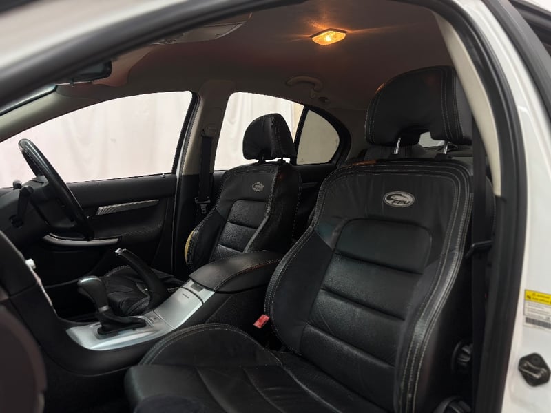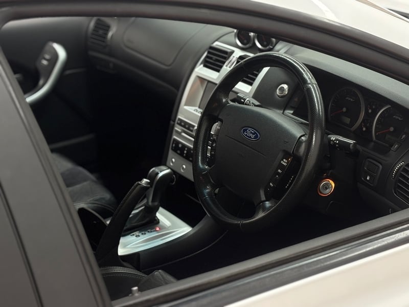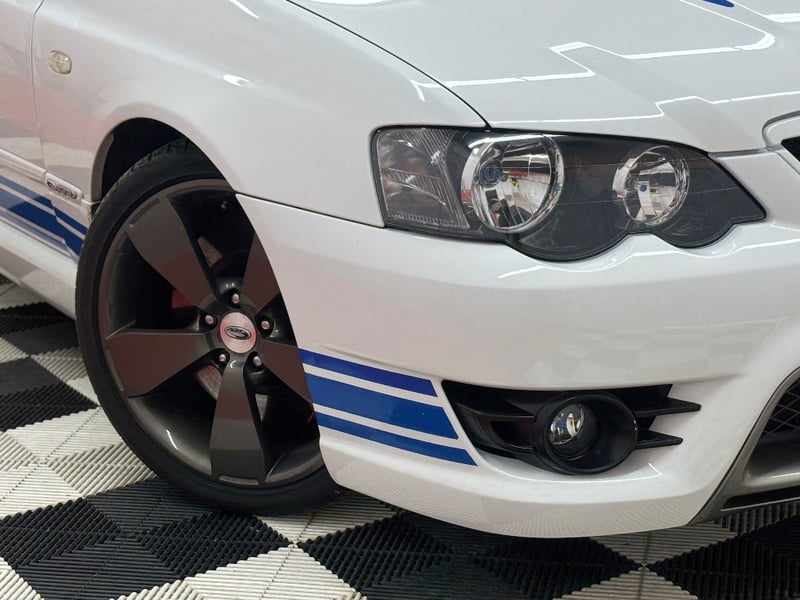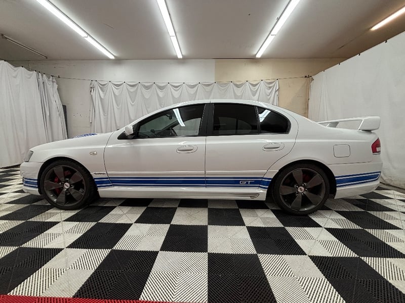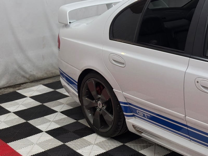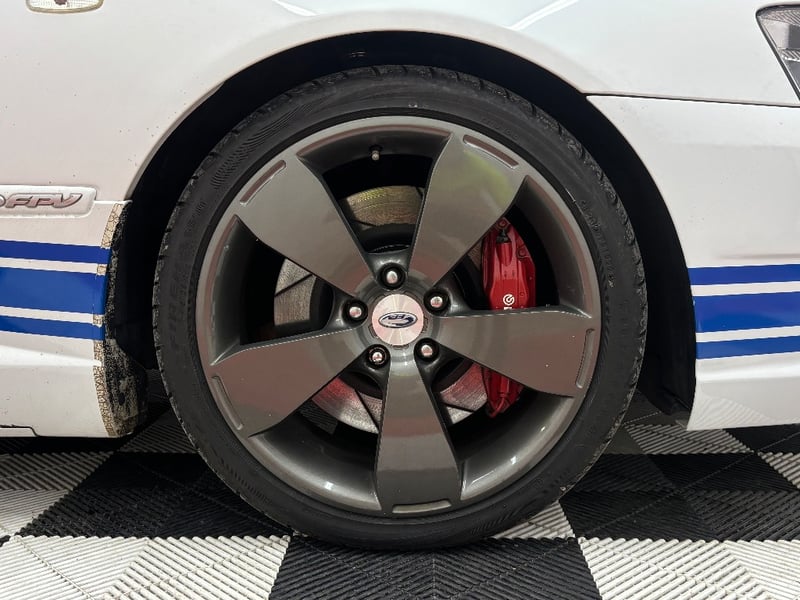 The BF FPV GT is one of the most complete Australian performance sedans Ford ever built. Under the bonnet sits the Boss 290 V8, pumping out 290kW and backed by a 6-speed automatic. Up front you have red Brembo calipers clamping on ventilated rotors, and the FPV-specific body kit gives it a properly aggressive stance without resorting to boy-racer theatrics. This one wears Winter White with blue Boss 290 racing stripes down the sides, dark gunmetal 5-spoke FPV alloys, and the signature GT duck-tail boot spoiler. It is an eye-catching combination that has aged well.
