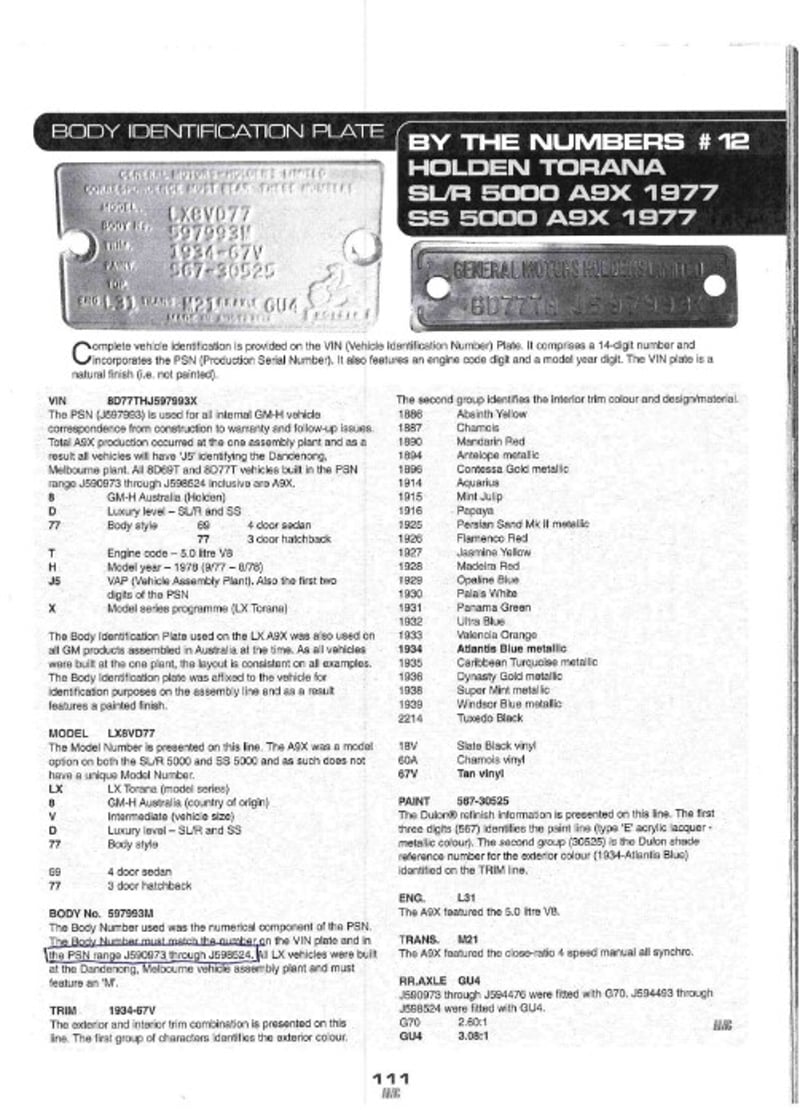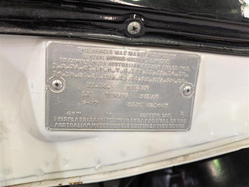 Production date: 06/09/1977. That is the date stamped on the first A9X Torana to come off the Holden line. Not the first of this colour. Not the first of this specification. The very first A9X SLR5000 sedan Holden ever built. PSN number one. Of the 500 sedans and hatches combined, this car wears the lowest Production Serial Number of them all. You will not find a more historically significant Torana in Australia. Full stop.