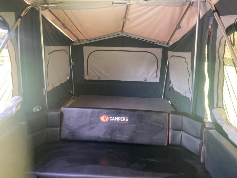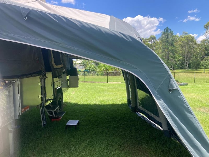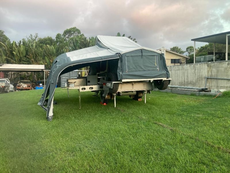 The camper features a spacious slide-out tent design with elevated roof section, providing generous internal living and sleeping space while maintaining a compact towing footprint. The large canvas setup offers comfortable accommodation in a variety of environments, making it a versatile option for travellers seeking convenience without compromising capability.