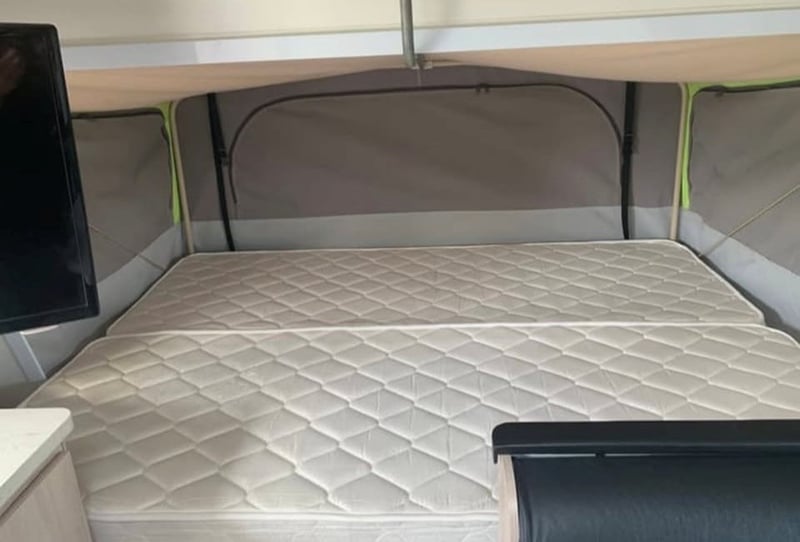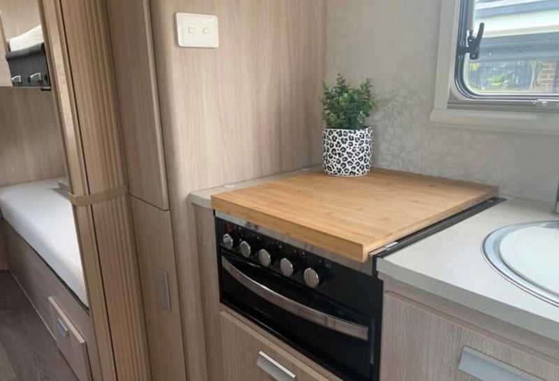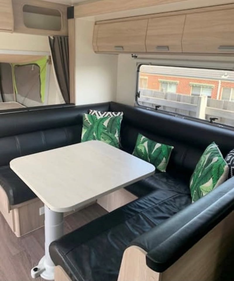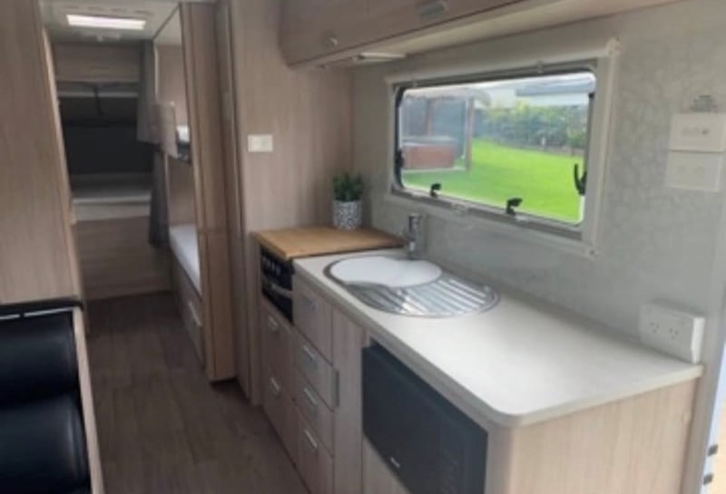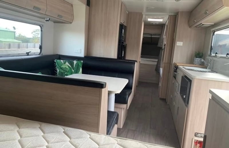 Inside, the caravan features the sought-after Expanda fold-down bed configuration with queen and double bed ends, complemented by a double bunk arrangement and an automatic slide-out leather club lounge that can accommodate additional guests. The layout provides comfortable sleeping for the whole family while maintaining a functional living and dining space. Full-length factory curtains for the bunks allow children to sleep undisturbed while the ensuite facilities are in use.