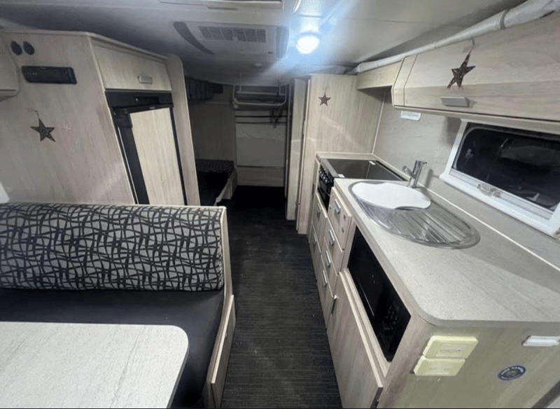 The caravan includes a fully functional kitchen setup with a 4-burner gas cooktop, grill, microwave and 3-way fridge/freezer, allowing for convenient meal preparation whether travelling on the road or set up at camp. A full internal ensuite with shower and toilet, supported by gas and electric hot water, ensures comfortable self-contained accommodation wherever your adventures take you.