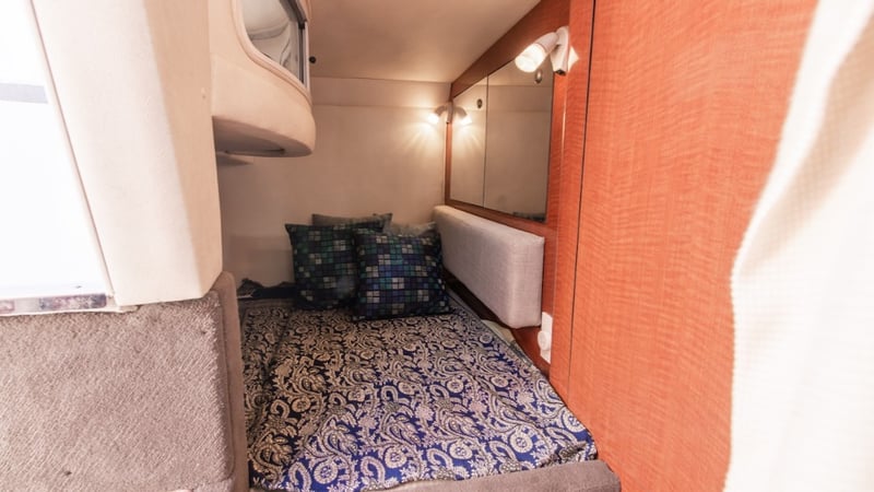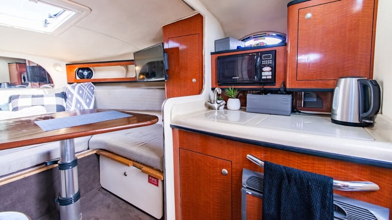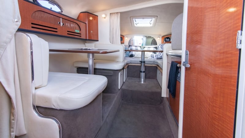 Below deck, the cabin is well appointed for overnight stays and extended weekends away, offering practical amenities and flexible sleeping arrangements suitable for families or groups of friends.