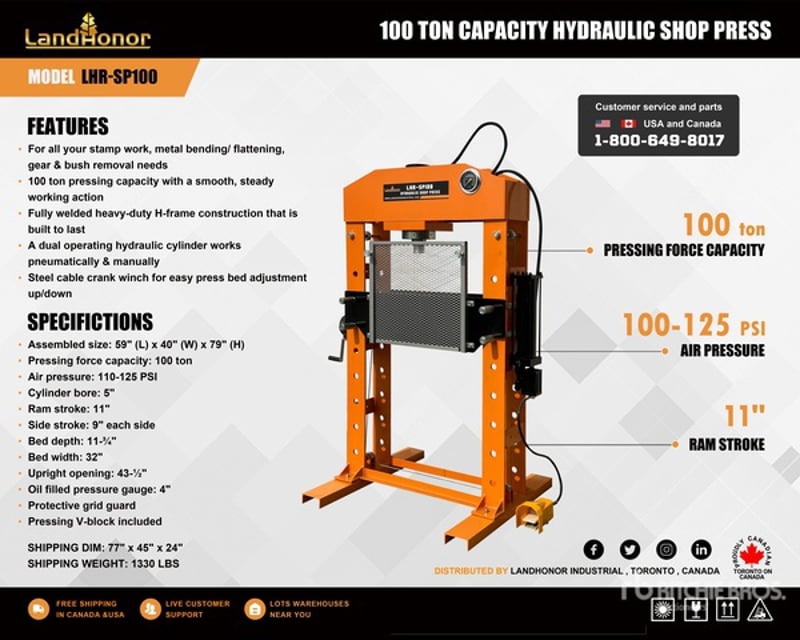 FACTORY DIRECT ** Unused 2026 Landhonor, Shop press - LDH-SP100Assembled size: 59" (L)x 40" (W) x 79"(H)Pressing force capacity: 100 tonAir pressure: 110-125 PSlCylinder bore: 5"Ram stroke: 11"Side stroke: g" each sideBed depth: 11-%"Bed width: 32'Upright opening: 43-%"Oil filled pressure gauge: 4"Protective grid guardPressing V-block includedSize Approx: 77"*45"*24"Weight Approx: 605 kgPlease note: minor scuffs and marks may be evident For more information Contact King Cheung on 0477987576 or [email protected] *** PLEASE NOTE Collections must occur within 7 days of Auction Ending*** Note: OEM images and VIDEOS shown are for illustration purposes only, and used as a guide only, inspections highly recommended. ZTCU4518004