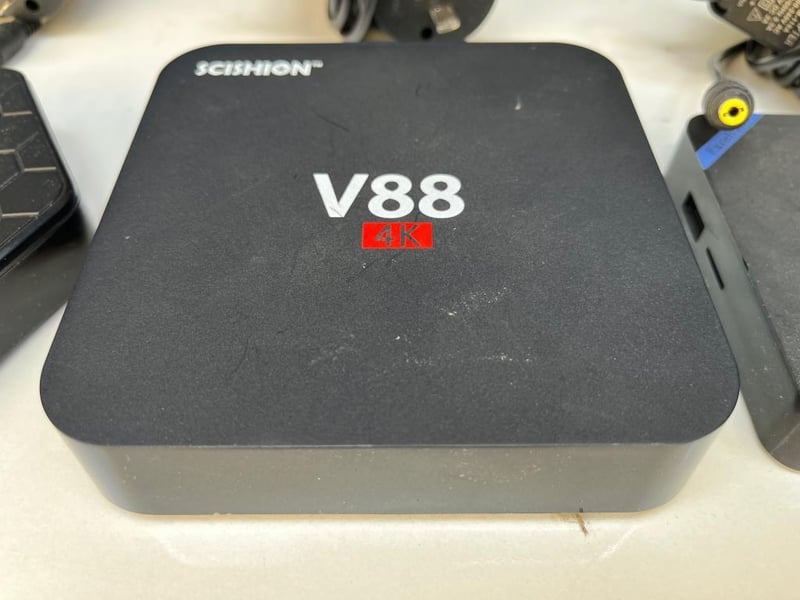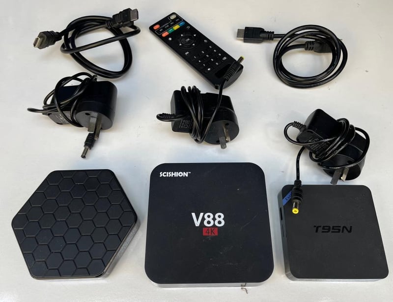 3 X Android TV Boxes with 3 X Power Supplies, 2 X HDMI Cables, 1 Remote SOLD AS 1 LOT