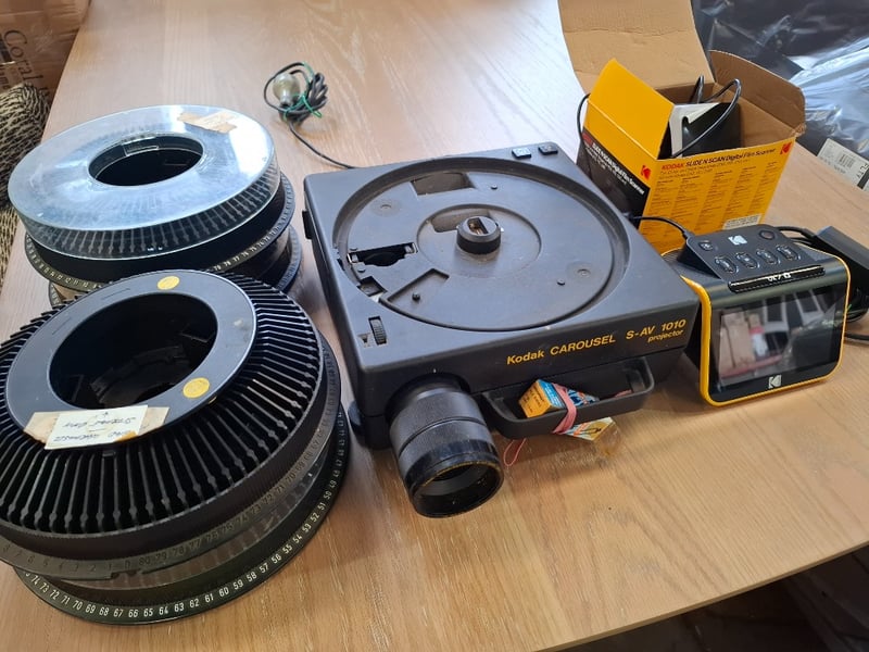 Kodak carousel S- AV 1010 projector, and Kodak slides scan, includes accessories Sold as lot