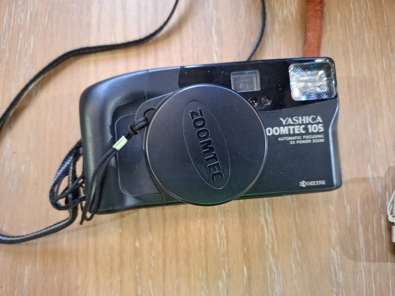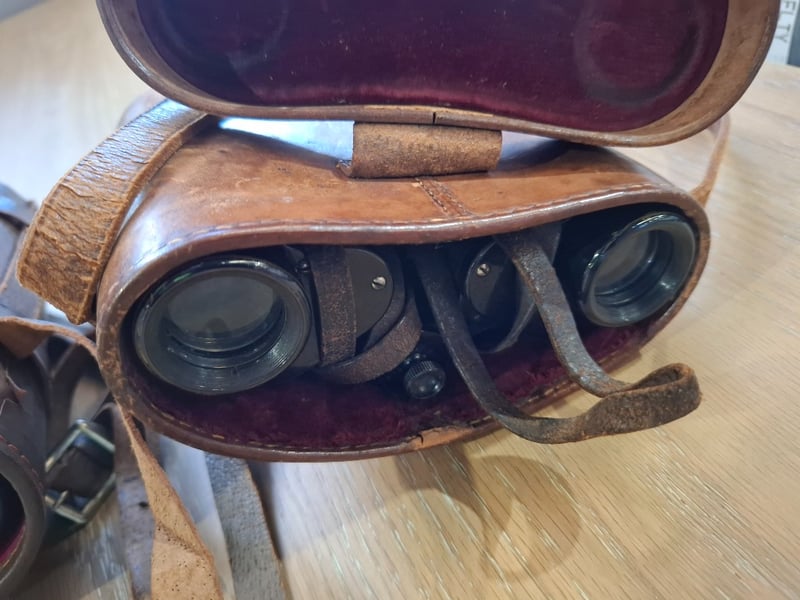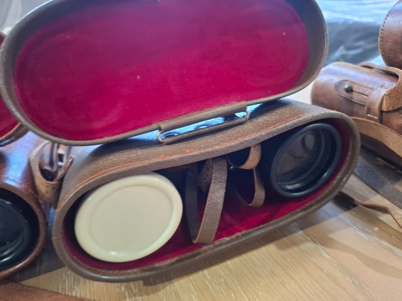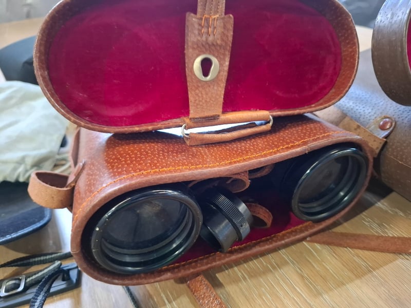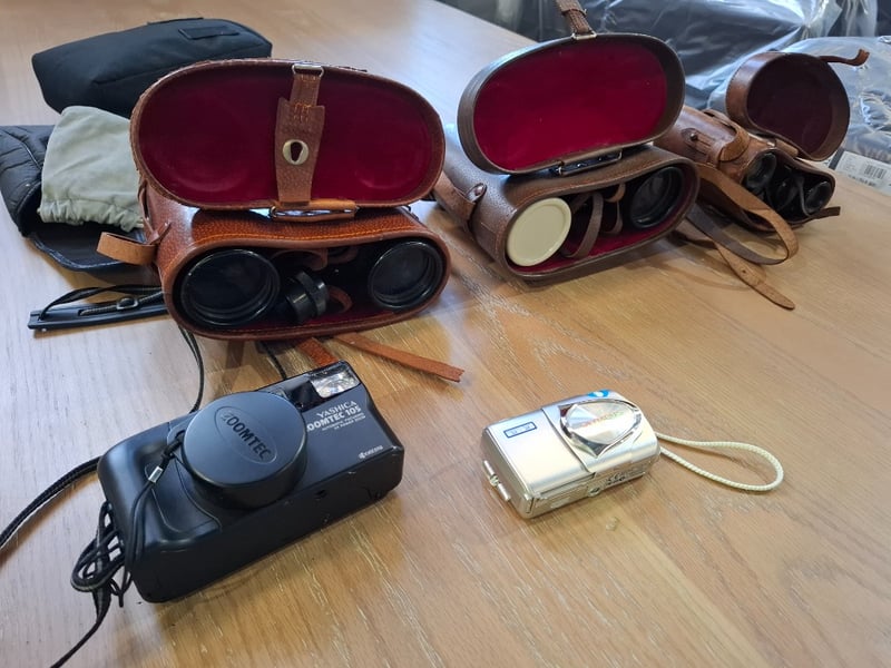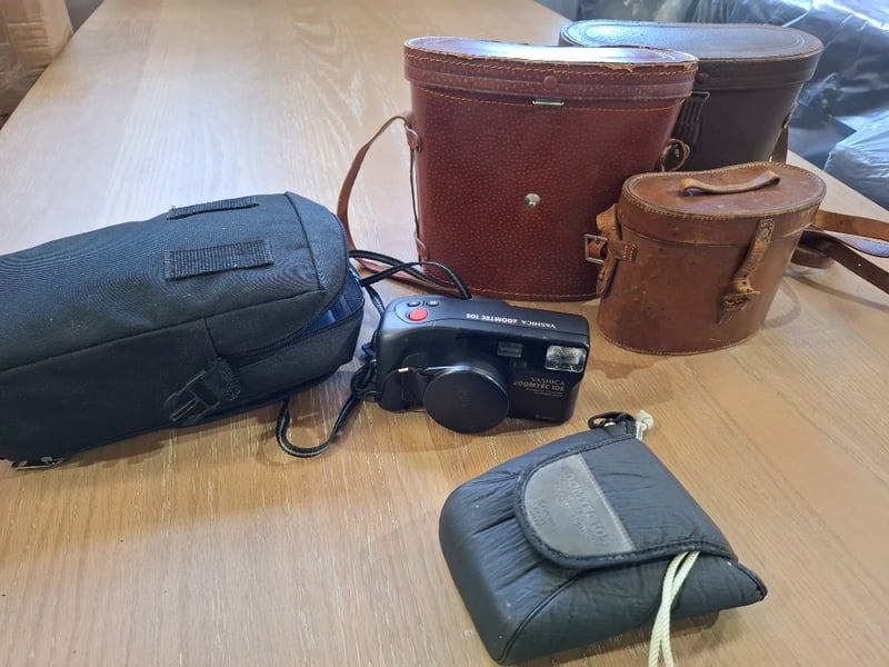 Asortment of 3x binoculars in leather cases and 1x Yashica zoomed 105 camera, 1x Olympus digital camera Sold as lot