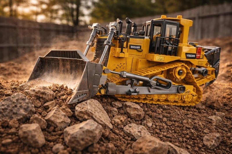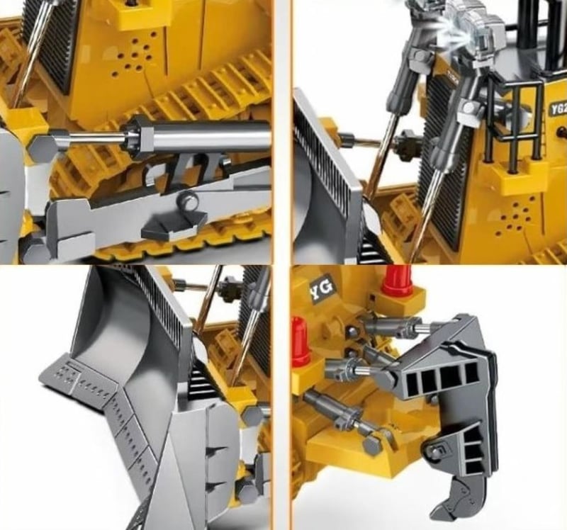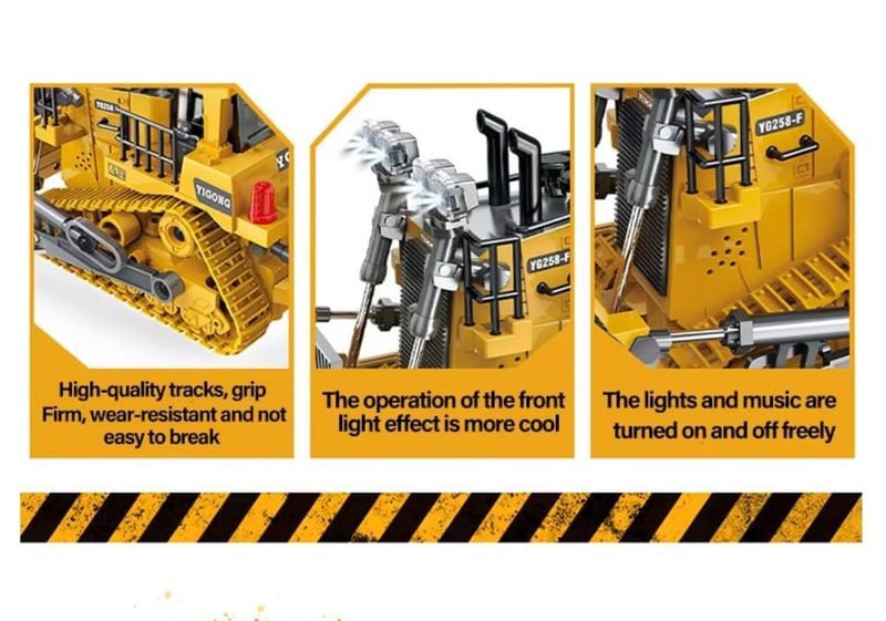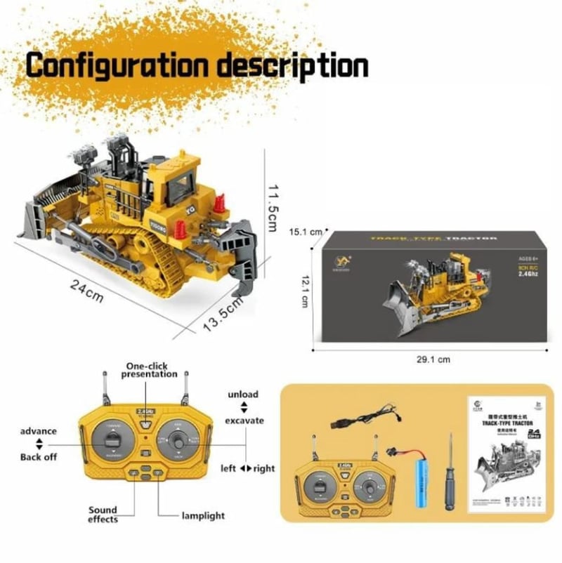 RC Bulldozer 2.4 GHZ 9 Channel Alloy & Plastic Constructions 360-degree Rotating Cabin Multiple Direction Control rubber tracks Sound and Lighting Function Multiple Direction Function Approx 24cm Length One Button Demo Mode (Remote Batteries not included) (NEW IN BOX) YELLOW (Sometimes in the creation of images and videos there may be very small differences in the product itself or size comparison, so these images are used only for the visual effect of the product shown, however the exact product with its specifications and size is always shown in the later photos so please be aware of this.)