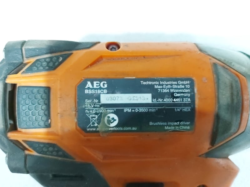 AEG BSS18CB 18V Brushless Impact Driver - 1/4" hex chuck, brushless motor, variable speed trigger, bare unit only – battery and charger not included.