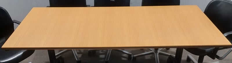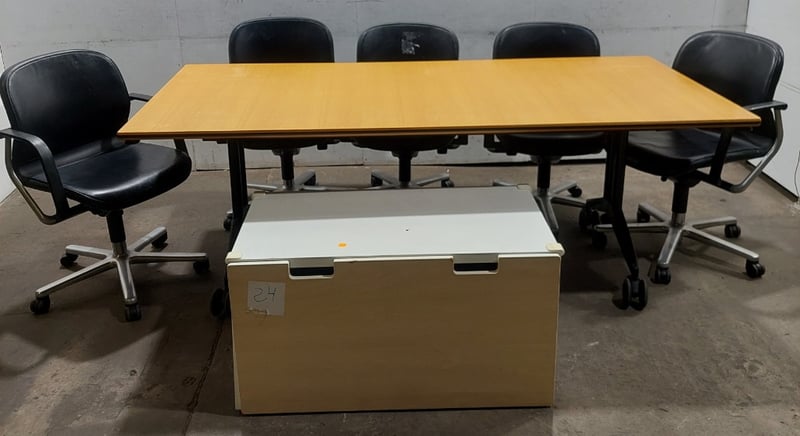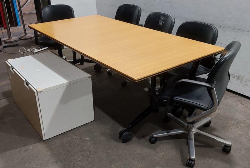 Boardroom table, woodlike, on castors Wilkhahn brand includes leather like Boardroom chairs on castors Wilkhahn brand and woodlike storage drawer. Dims: table- 74cm H, 100cm W, 200cm DDims: Chair- 83cm H, 53cm W. 58cm DDims: Drawer- 49cm H, 51cm W, 92cm DSold as alot. Notes: items untested and signs of wear.