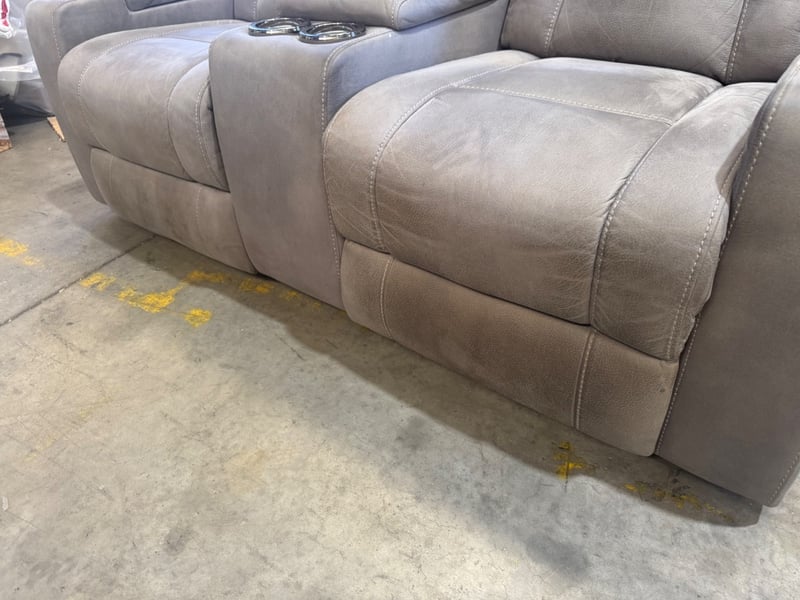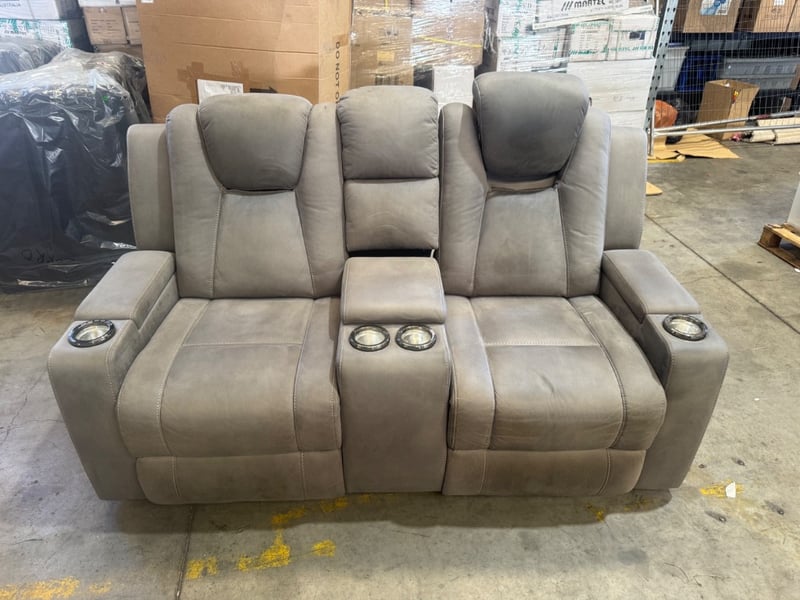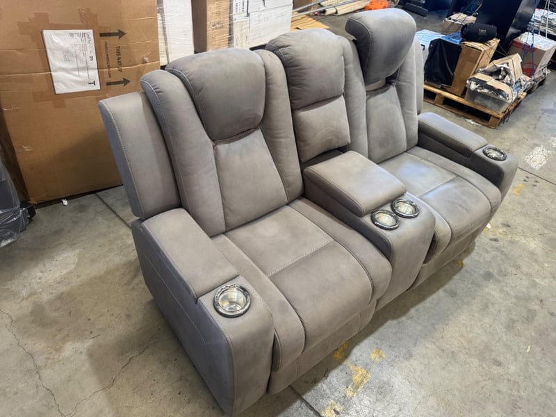 2 electric recliner, light grey upholstery, console, 3 storage compartments 4 cups holder, LED lights,