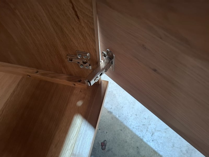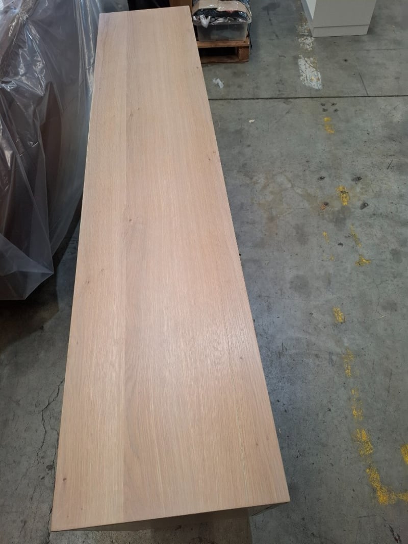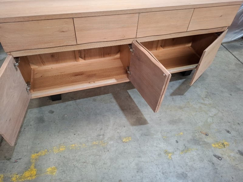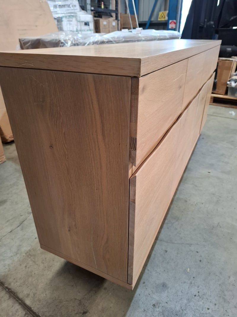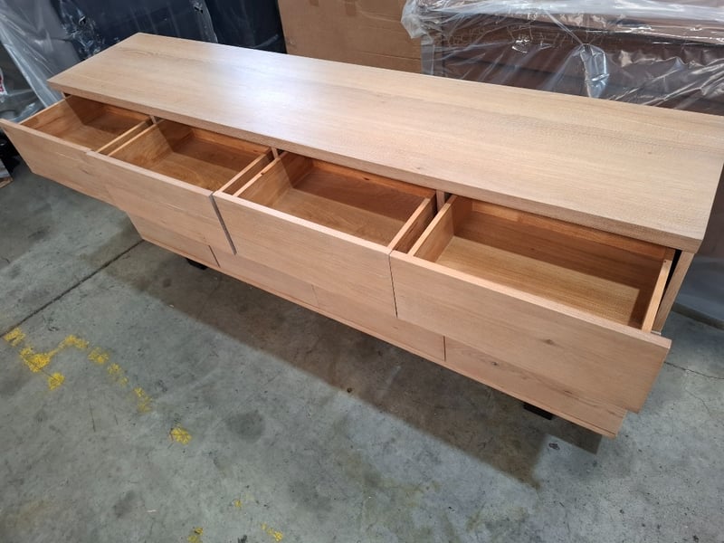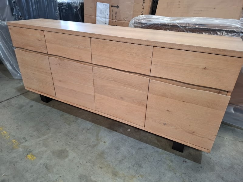 Buffet, timber light white wash finish 4 drawers, 4 doors, black metal feet Dimension: 180cmW x 38cmD x 81cmH Note: loose door