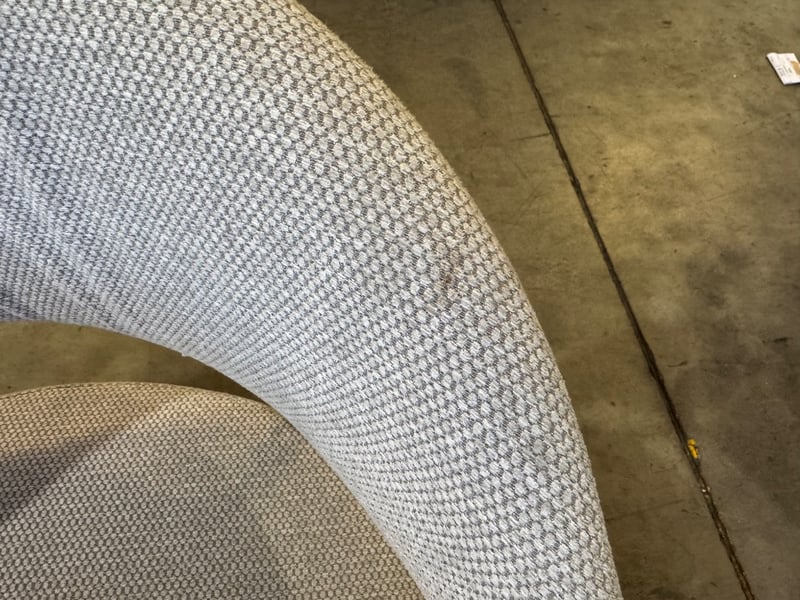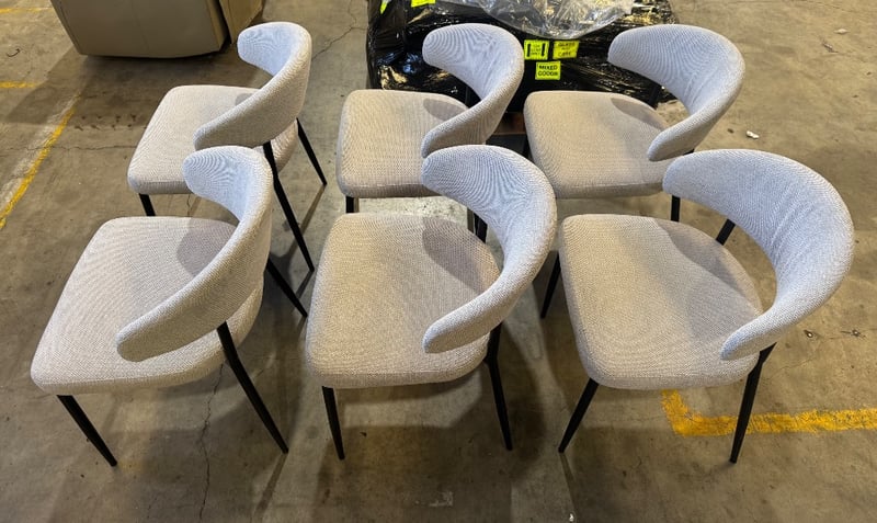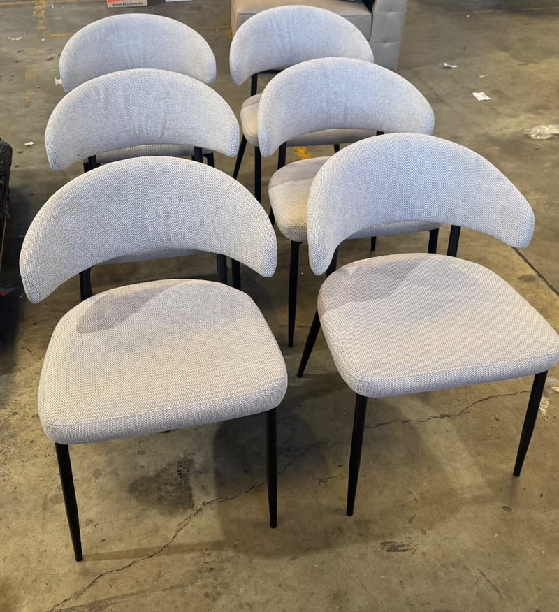 Dining chairs, light grey fabric, black metal frame Qty: 6 Note: sold as Lot