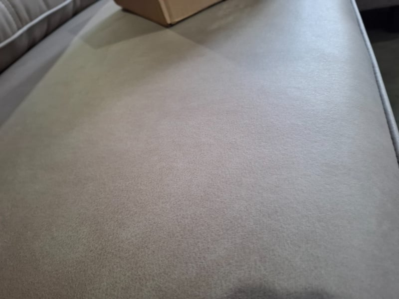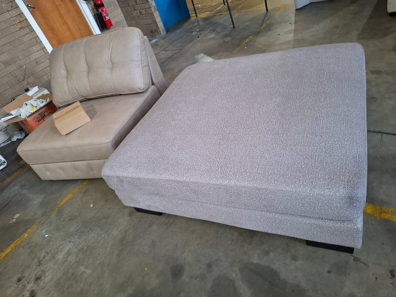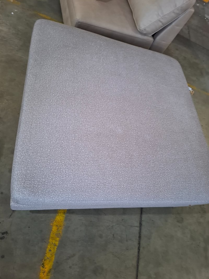 Grey fabric Ottoman and single couches, beige upholstery Ottoman: 128x129x43cm Couch: 98x105x80cm Sold as lot