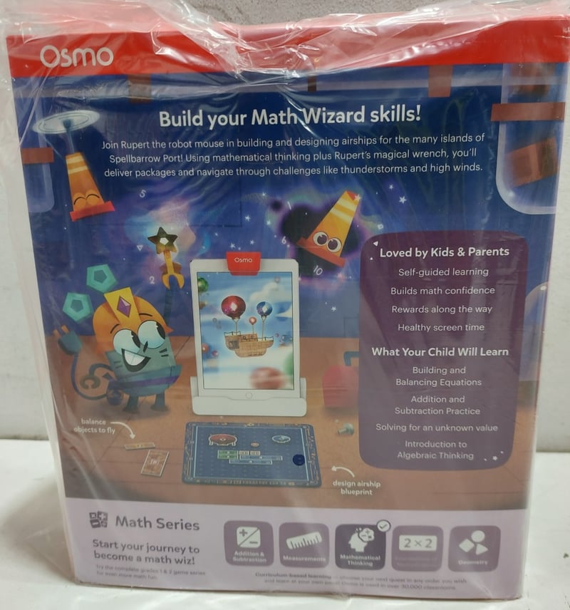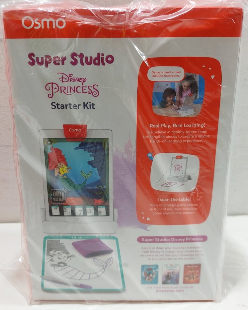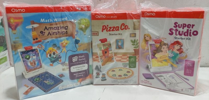 OSMO MATHS WIZARDS AND THE AMAZING AIRSHIPS GAME, OSMO PIZZA CO and OSMO SUPER STUDIO DISNEY PRINCESS STARTER KIT..