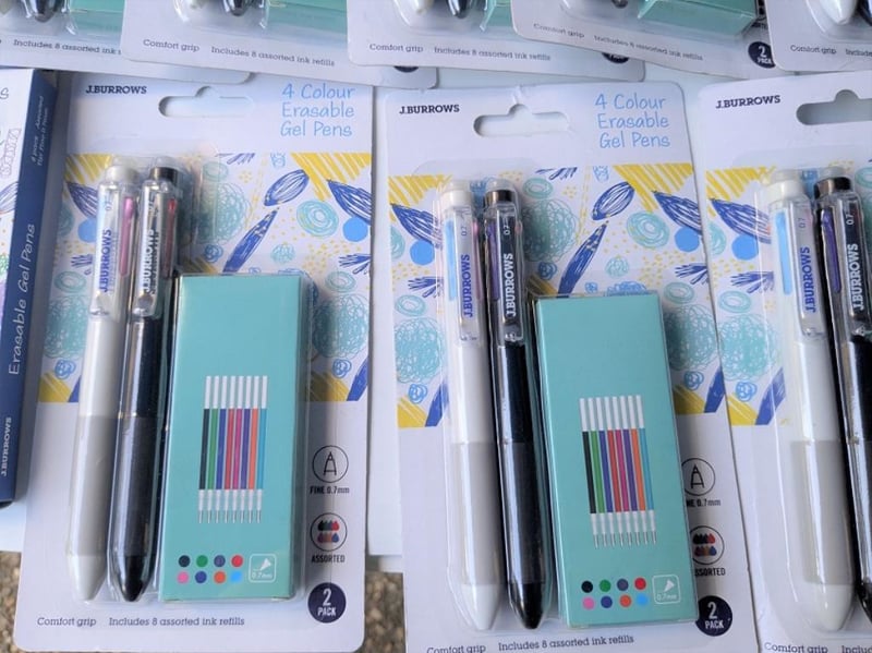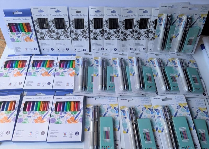 Bulk lot of Burrows eraseable gel pens incl 4 colour pens, $175 approx value, qty of 27 packs (sold as lot)
