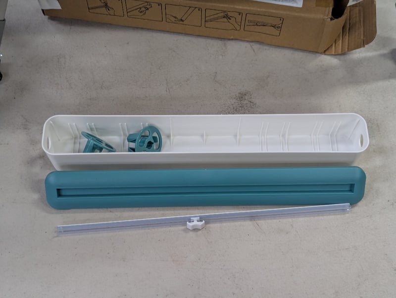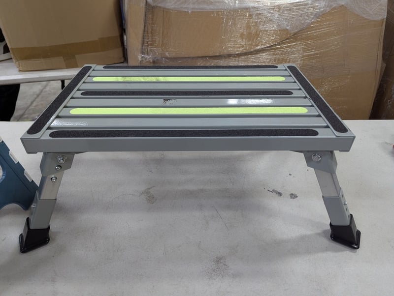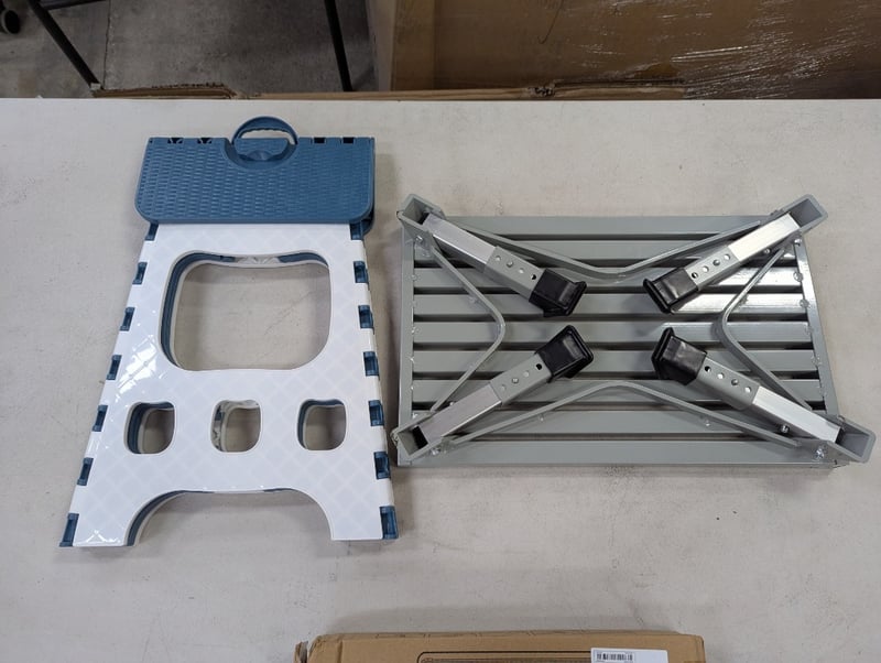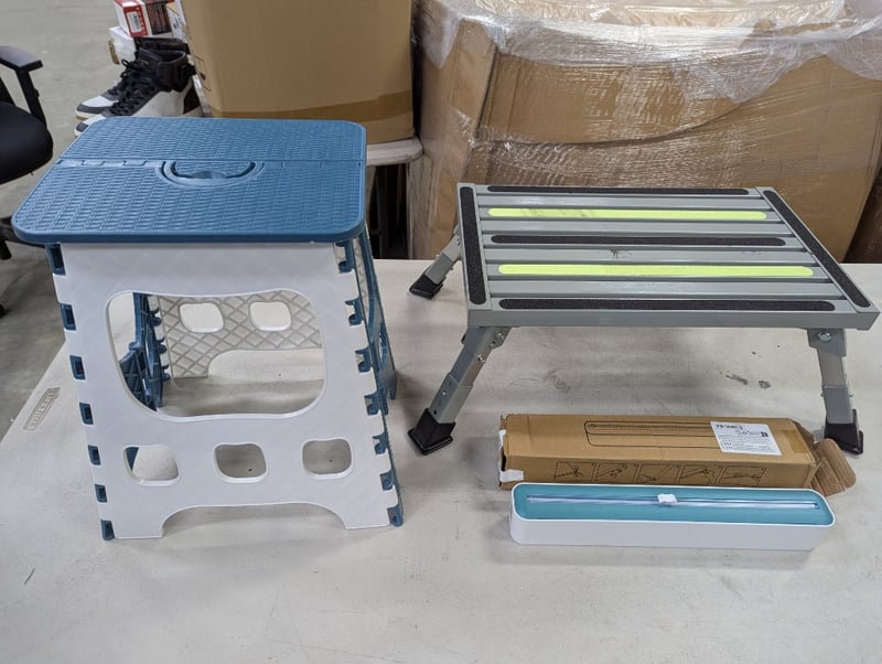 Two fold up stepping stools and cling film box, stepping stools inkude one plastic and one metal constructionSold as lot