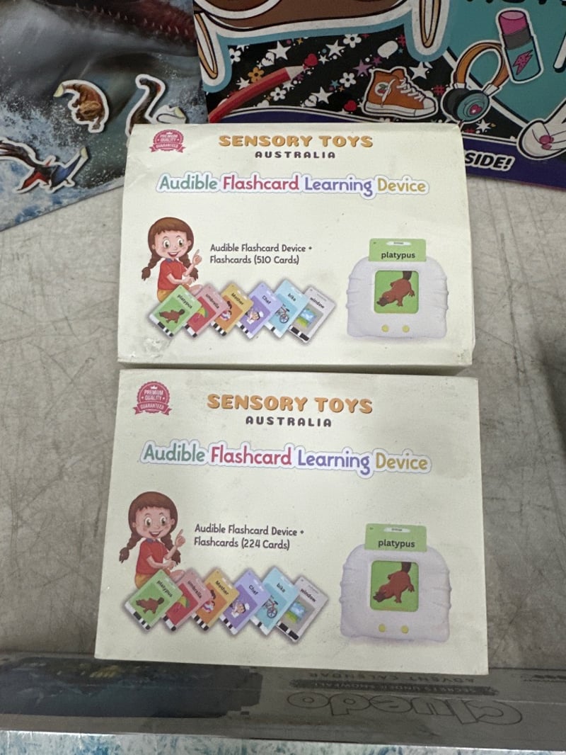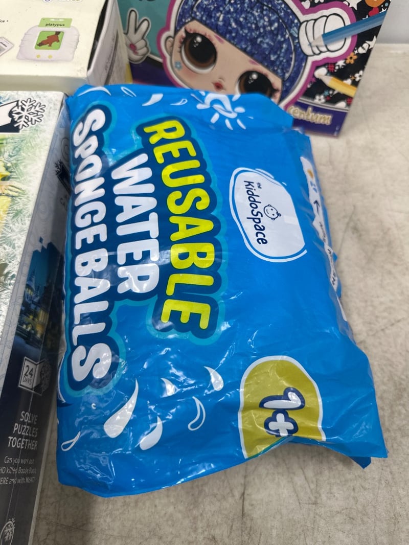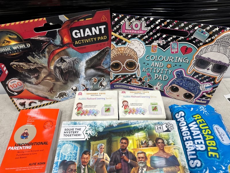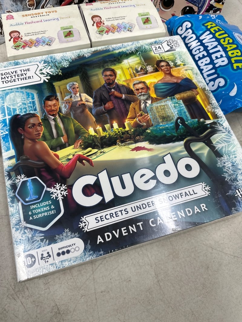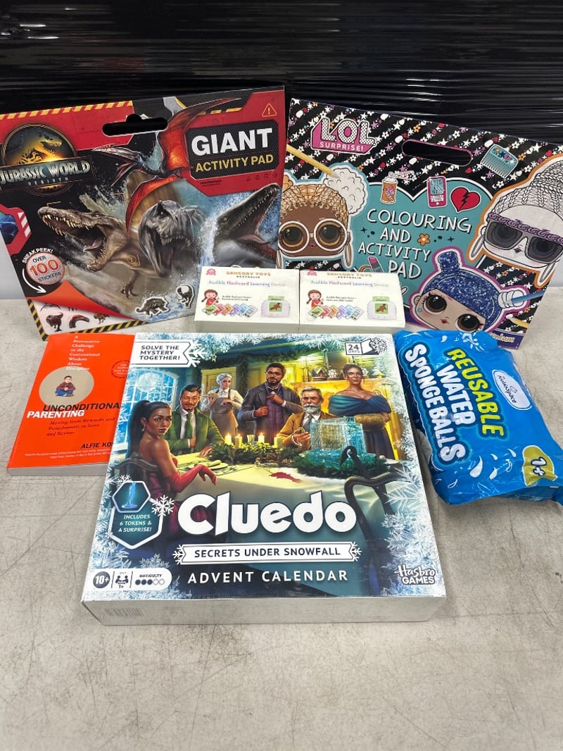 Kids assorted lotCluedo advent calendar, reusable water spongeballs, unconditional parenting book, Jurassic park activity pad, LOL activity pad & 2x audible flash card learning device.Sold as lot