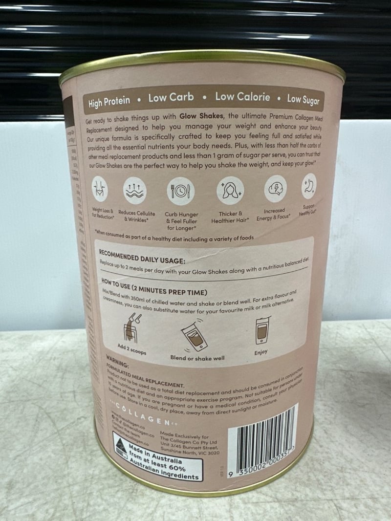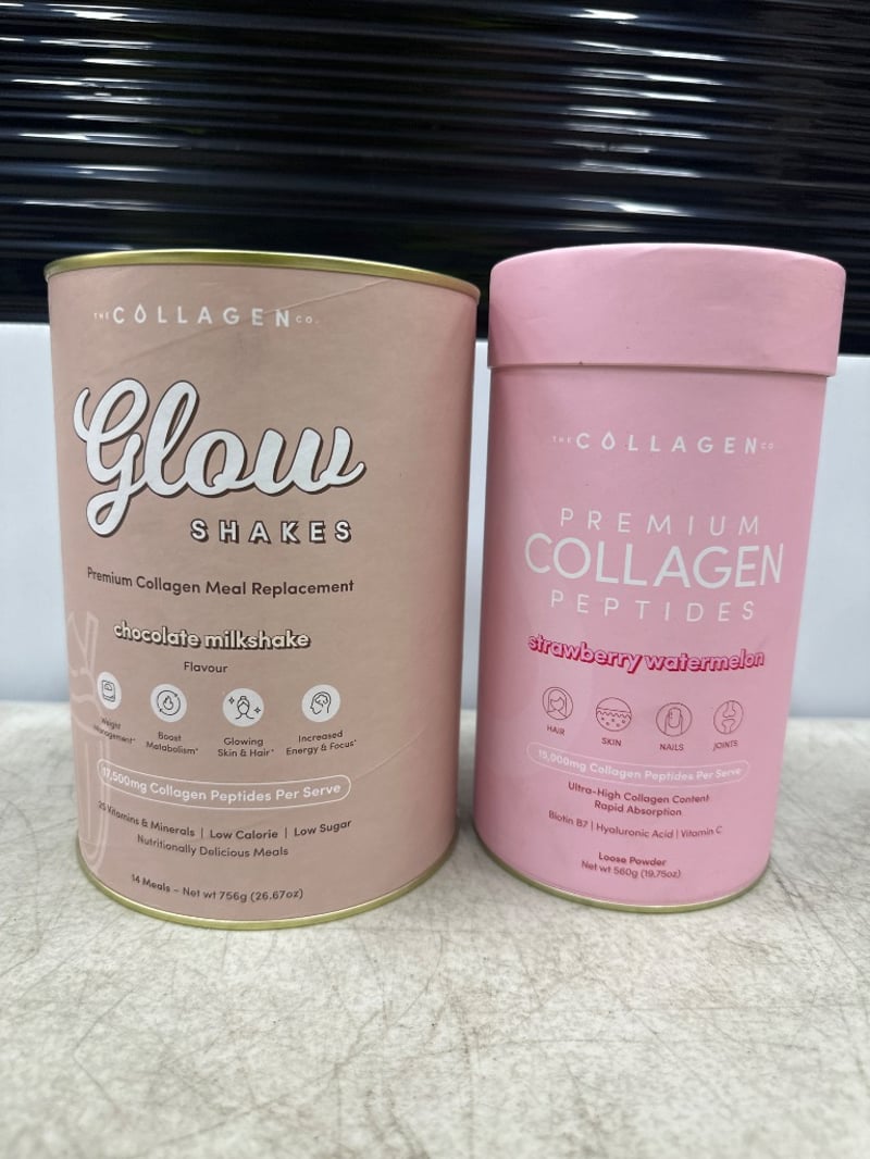 The Collagen co - Glow shakes Chocolate milkshake & premium collagen peptides strawberry watermelon.Sold as lot