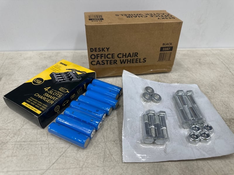Assorted lot - Desky office chair caster wheels, nuts and bolts. Charger & batteries
