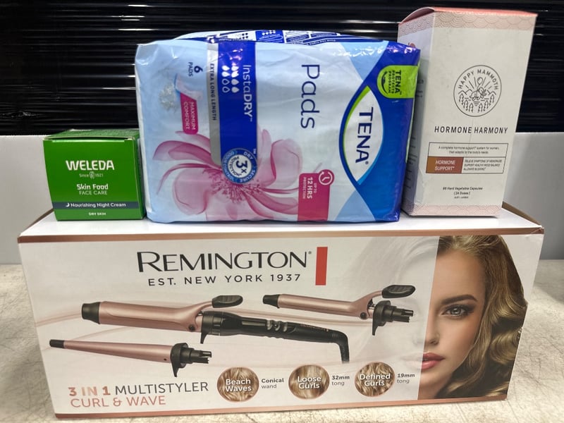 Assorted lotIncluding: Remington multistyler, Weleda Nourishing night cream, Hormone Harmony capsules & Tena PadsSold as lot