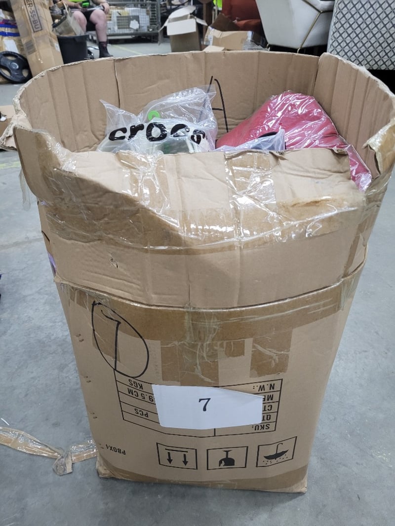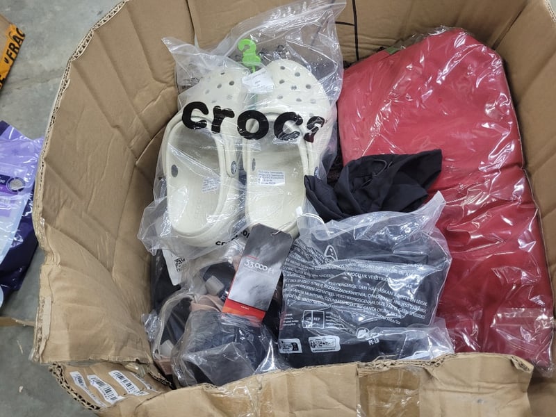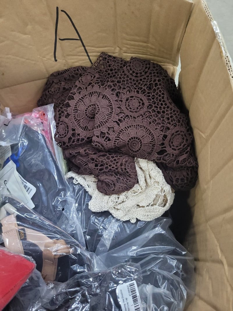Clothing, Christmas wreaths, drink bottlesLarge box qty assorted (Sold as lot)