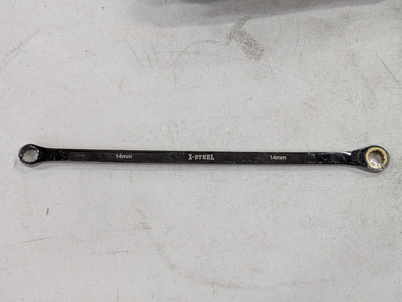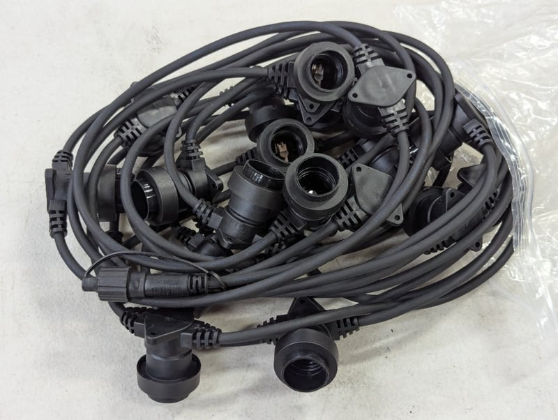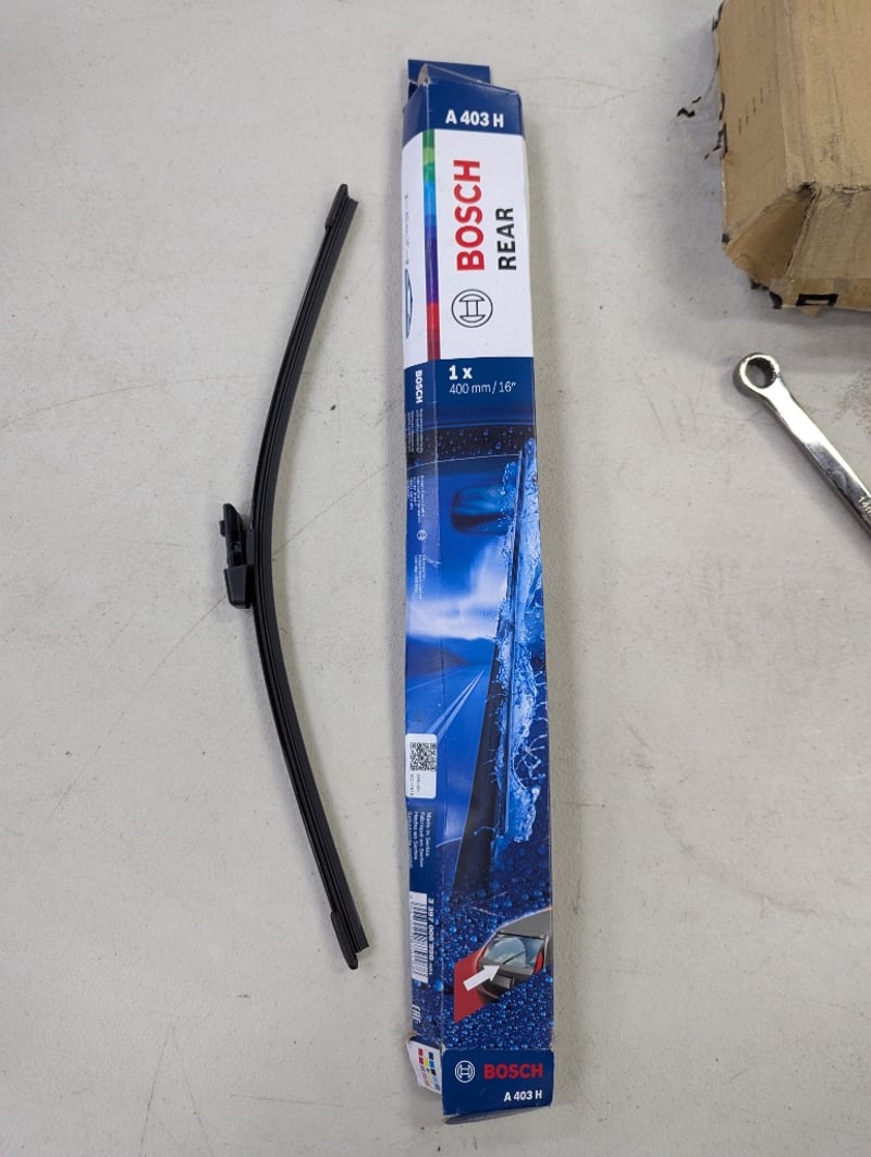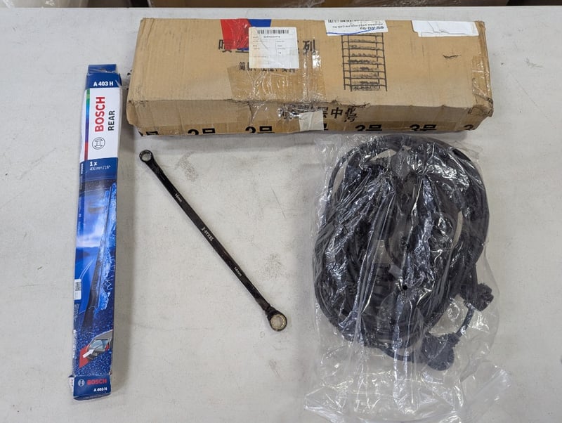 Length of waterproof string light wire and sockets, one bosch rear windshield wiper, shoe rack, x-steel 14mm ring spannerSold as lot