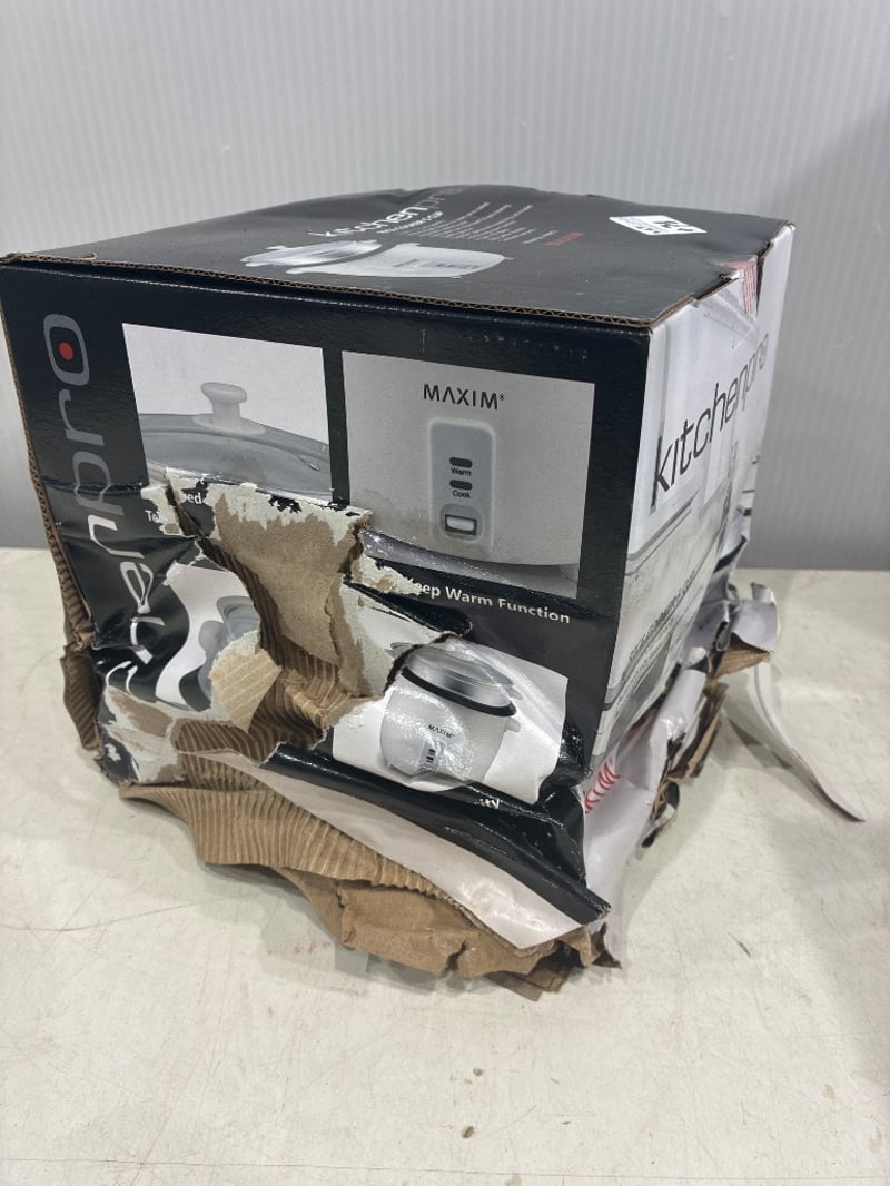 RRP$59.99 Maxim Rice Cooker 5 Cup Model No.: RKMC5 450 watts power 1 Litre = 5 Cup capacity Automatically keeps rice warm once cooked Automatic cooking cycle Removable, aluminium non-stick bowl for easy cleaning Quality glass lid Steamer, Spatula & measuring cup included Cook & keep warm function SOLD AS IT Note: Untested - Inspection highly recommended