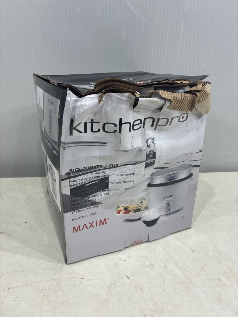 RRP$59.99 Maxim Rice Cooker 5 Cup Model No.: RKMC5 450 watts power 1 Litre = 5 Cup capacity Automatically keeps rice warm once cooked Automatic cooking cycle Removable, aluminium non-stick bowl for easy cleaning Quality glass lid Steamer, Spatula & measuring cup included Cook & keep warm function SOLD AS IT Note: Untested - Inspection highly recommended