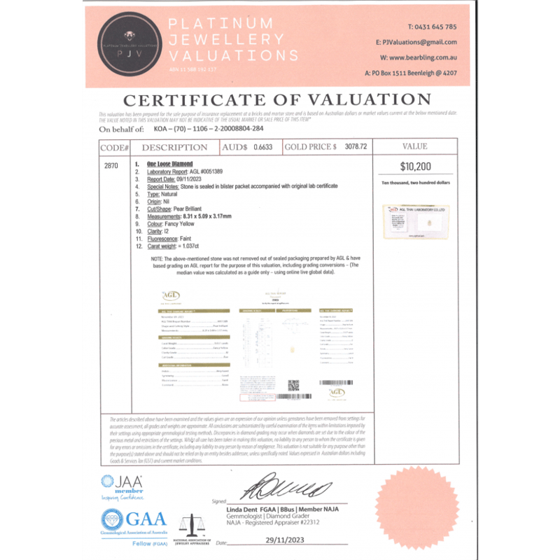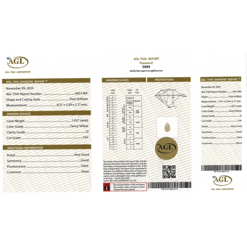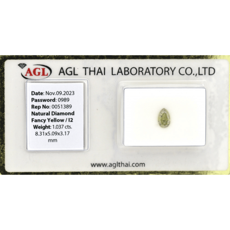 Pear Brilliant Cut, Fancy Yellow, I2 Clarity, Loose, Unset. Stone Comes Sealed With Agl Report: 0051389.