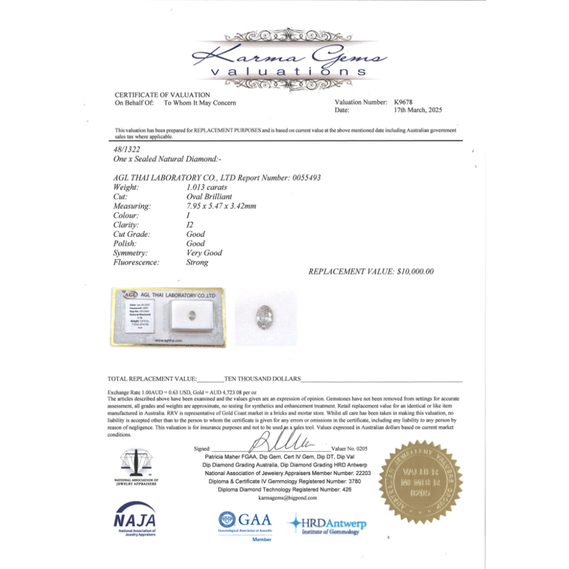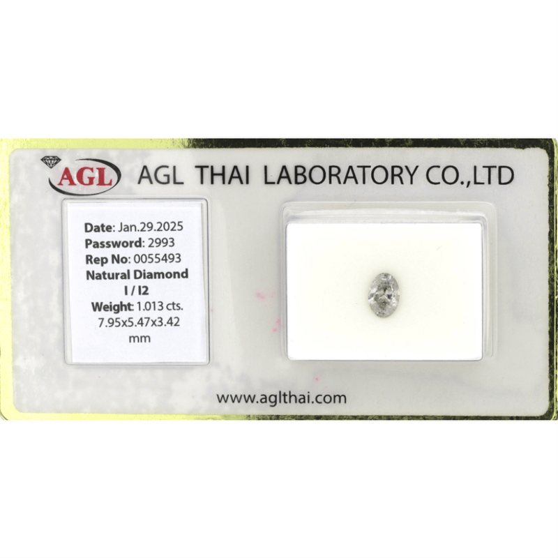 1.013CT CERTIFIED, NATURAL DIAMOND Oval Brilliant Cut, I Colour, I2 Clarity, Loose, Unset. Stone Comes Sealed With Agl Report: 0055493. Valuations Provided by an Independent Third-Party Professional Not Directly Associated With Lloyds Auctions at AUD $$10,000.00This valuation has been conducted by an independent third-party professional. The valuation amount is an assessment by the issuing valuer and does not reflect the auction value of the item. Any inquiries regarding the valuation should be directed to the issuing valuer (refer to contact details on the certificate), as Lloyds Auctions has no affiliation or influence over the valuation, the valuer, or the stated amount. Condition: Good - Refer Images 0645981+9317