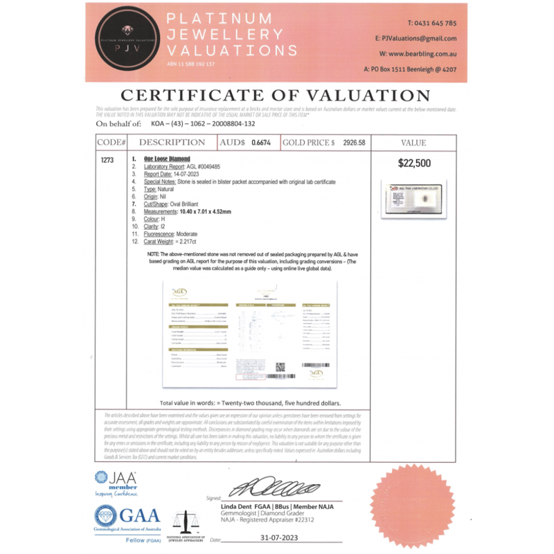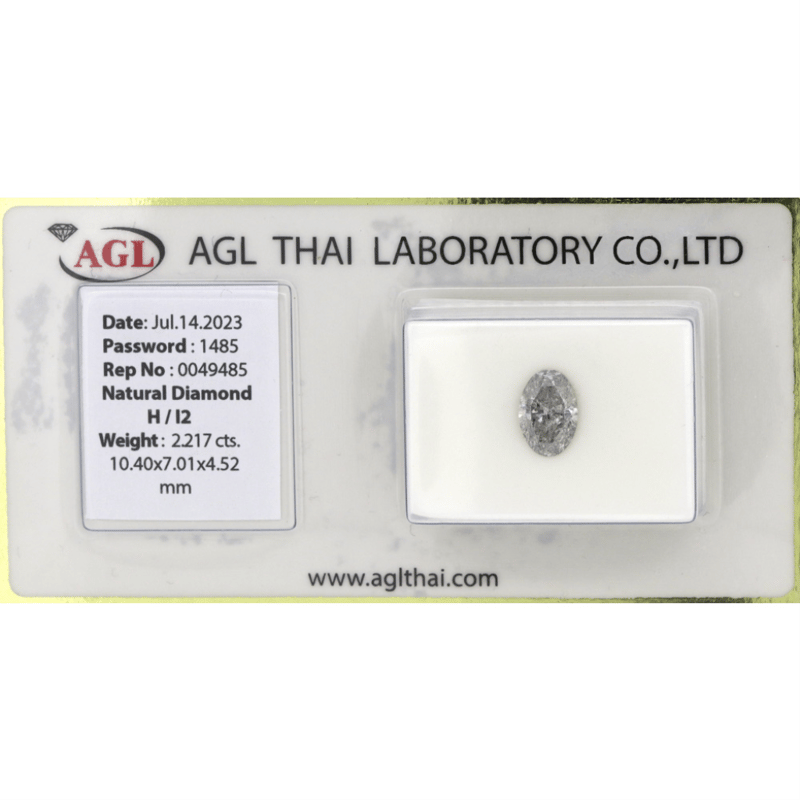2.217CT CERTIFIED, NATURAL DIAMOND Oval Brilliant Cut, H Colour, I2 Clarity, Loose, Unset. Stone Comes With Agl Report: 0049485. Valuations Provided by an Independent Third-Party Professional Not Directly Associated With Lloyds Auctions at AUD $$22,500.00This valuation has been conducted by an independent third-party professional. The valuation amount is an assessment by the issuing valuer and does not reflect the auction value of the item. Any inquiries regarding the valuation should be directed to the issuing valuer (refer to contact details on the certificate), as Lloyds Auctions has no affiliation or influence over the valuation, the valuer, or the stated amount. Condition: Good - Refer Images 0645981+9333