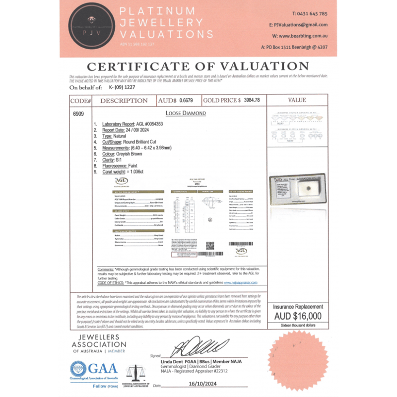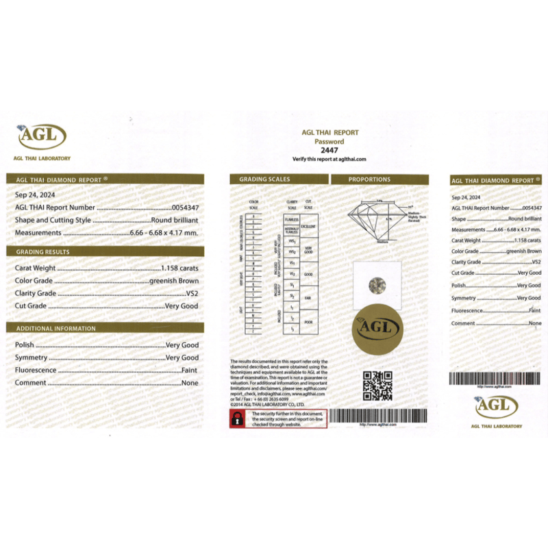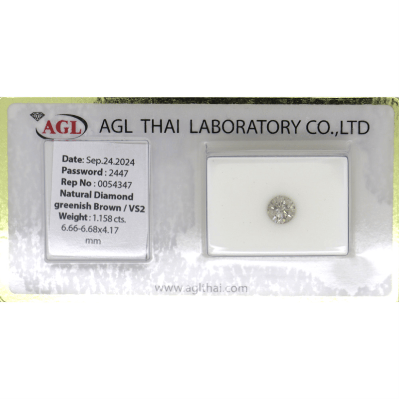 1.158CT CERTIFIED, NATURAL GREEN/BROWN DIAMOND Round Brilliant Cut, Greenish-Brown Colour, Vs2 Clarity, Loose, Unset. Stone Comes Sealed With Agl Report: 0054347. Valuations Provided by an Independent Third-Party Professional Not Directly Associated With Lloyds Auctions at AUD $$16,000.00This valuation has been conducted by an independent third-party professional. The valuation amount is an assessment by the issuing valuer and does not reflect the auction value of the item. Any inquiries regarding the valuation should be directed to the issuing valuer (refer to contact details on the certificate), as Lloyds Auctions has no affiliation or influence over the valuation, the valuer, or the stated amount. Condition: Good - Refer Images 0645981+9355