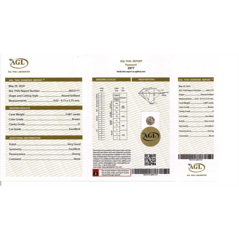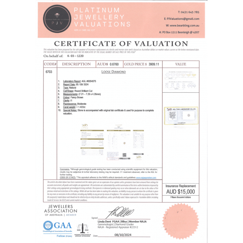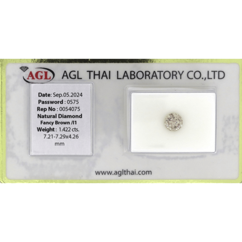 1.422CT CERTIFIED, NATURAL FANCY BROWN DIAMOND Round Brilliant Cut, Fancy Brown Colour, I1 Clarity, Loose, Unset. Stone Comes Sealed With Agl Report: 0054075. Valuations Provided by an Independent Third-Party Professional Not Directly Associated With Lloyds Auctions at AUD $$15,000.00This valuation has been conducted by an independent third-party professional. The valuation amount is an assessment by the issuing valuer and does not reflect the auction value of the item. Any inquiries regarding the valuation should be directed to the issuing valuer (refer to contact details on the certificate), as Lloyds Auctions has no affiliation or influence over the valuation, the valuer, or the stated amount. Condition: Good - Refer Images 0645981+9359