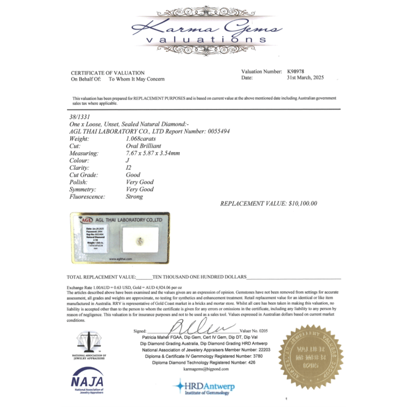 Oval Brilliant, J Colour, I2 Clarity, Loose, Unset. Stone Comes Sealed With Agl Report: 0055494.