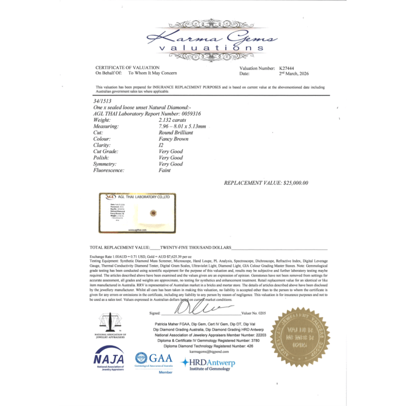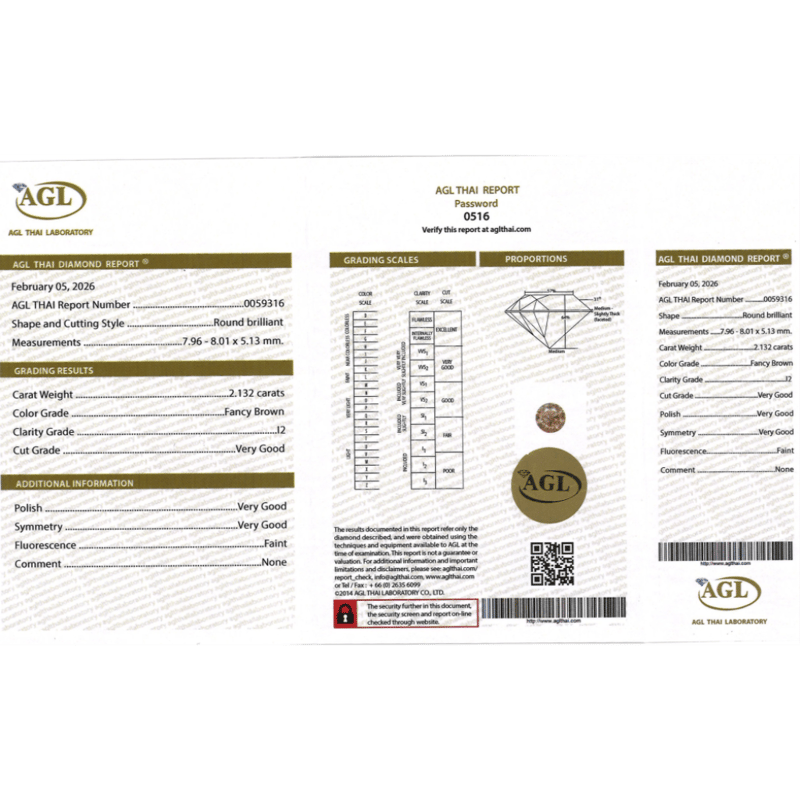 Round Brilliant Cut, Fancy Brown Colour, I2 Clarity, Loose, Unset. Stone Comes Sealed With Agl Report: 0059316.