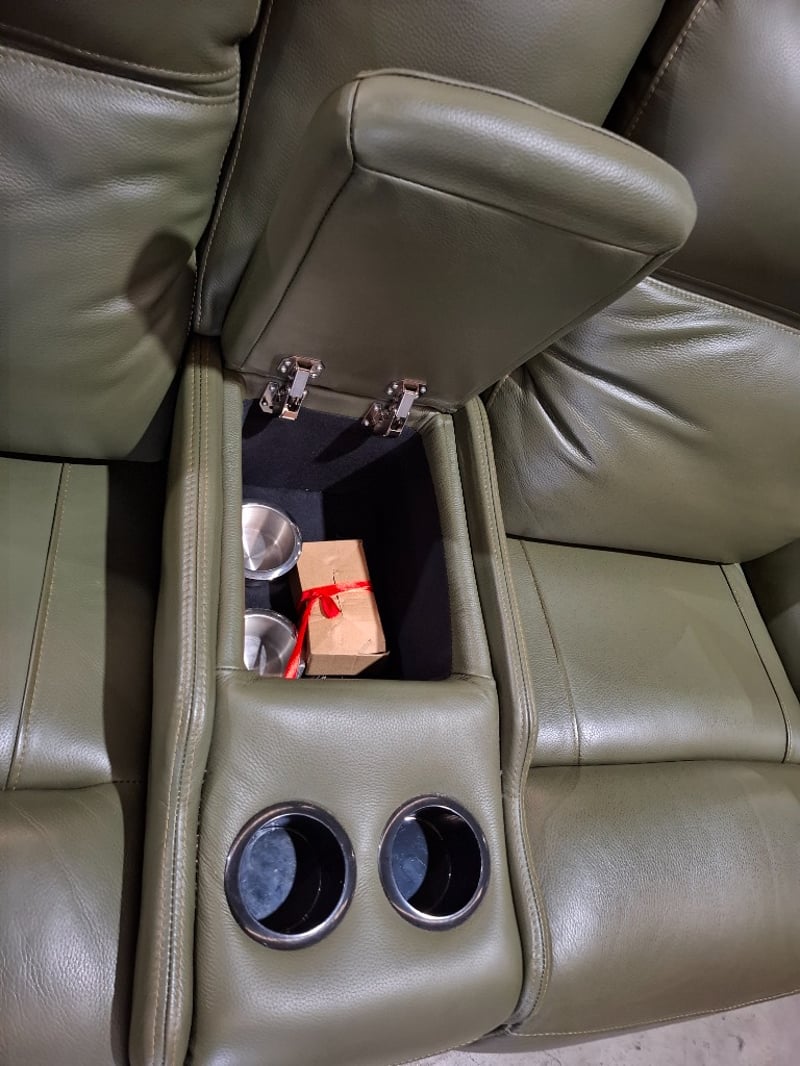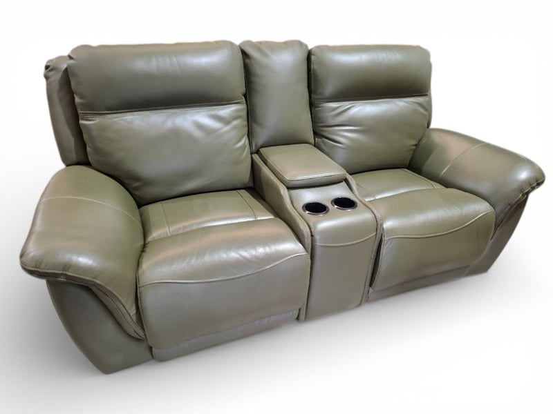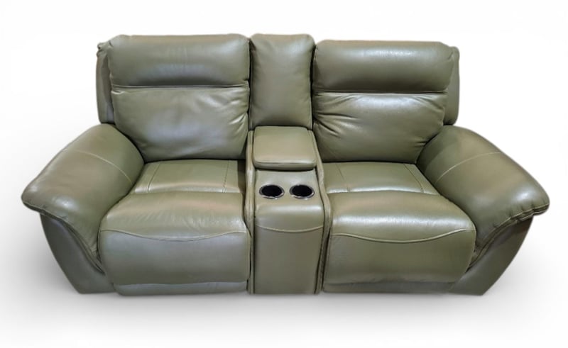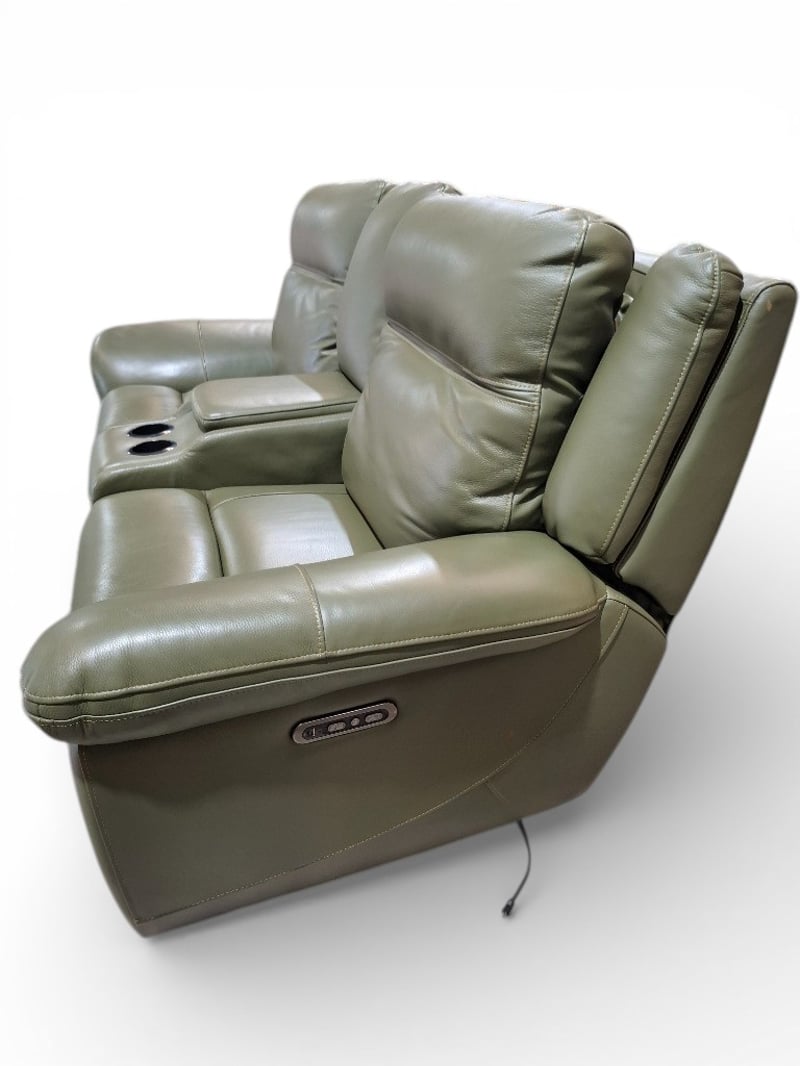 RRP $4590 2 Seater electric recliner, console, two cups holders, leather green colour , USB port Dimensions: 204cmWx 104cmD x 100cmH